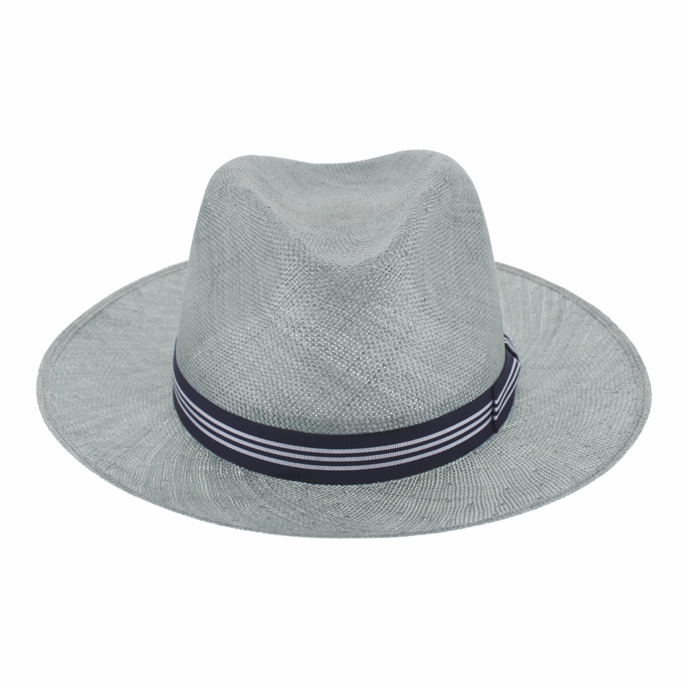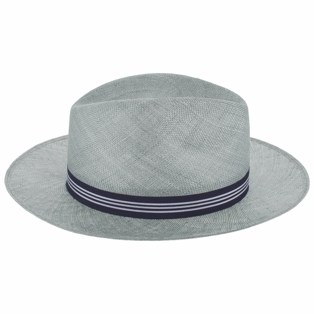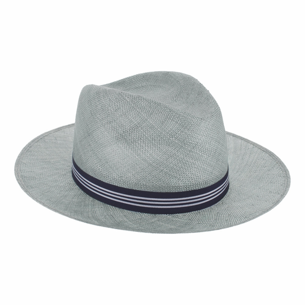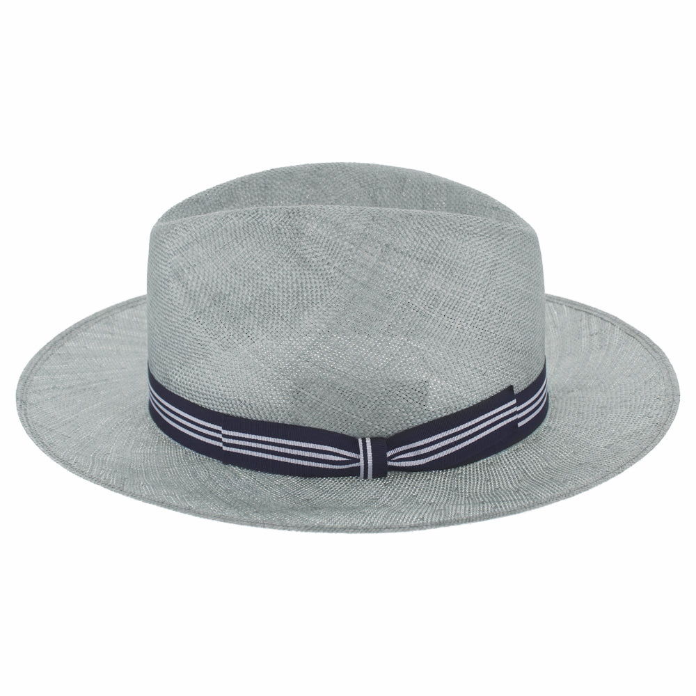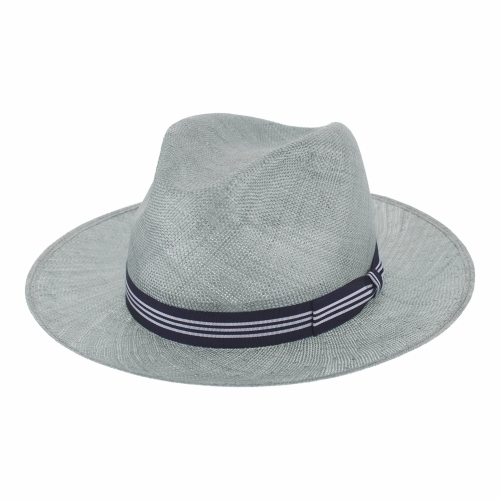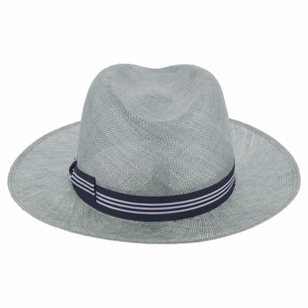 Handcrafted cerulean sisal straw fedora with classic pinch crown and navy band, designed for polished summer fashion