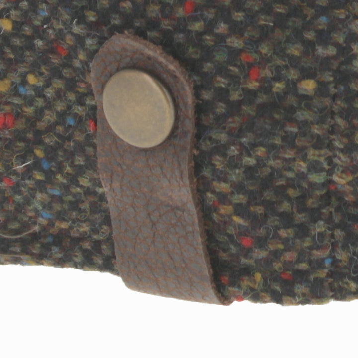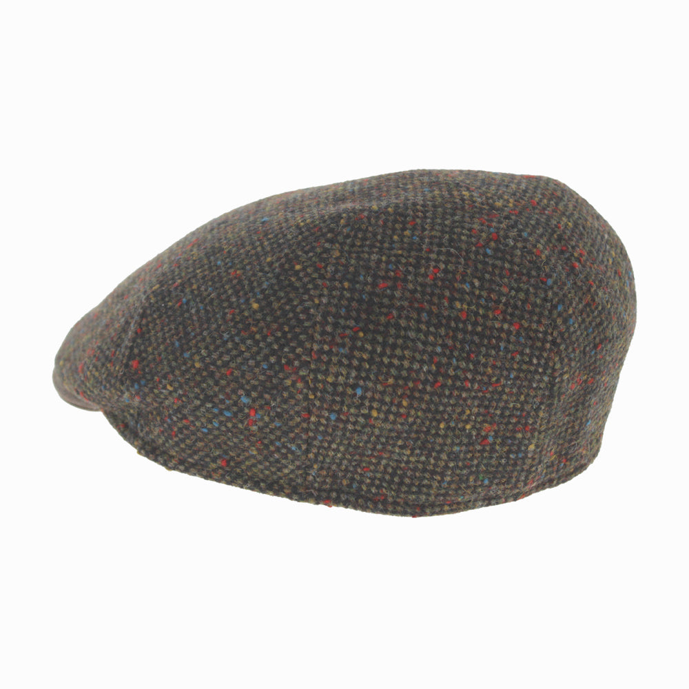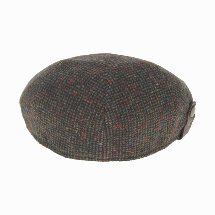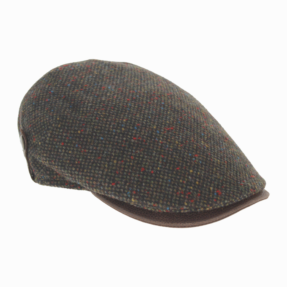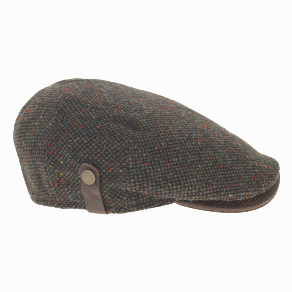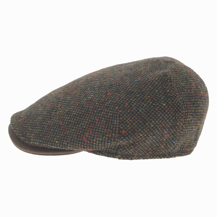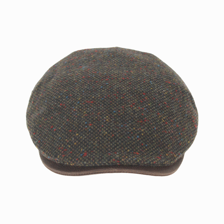 Green Belfry Sigfrido wool flat cap, nailhead weave with colorful flecks and medium curved peak