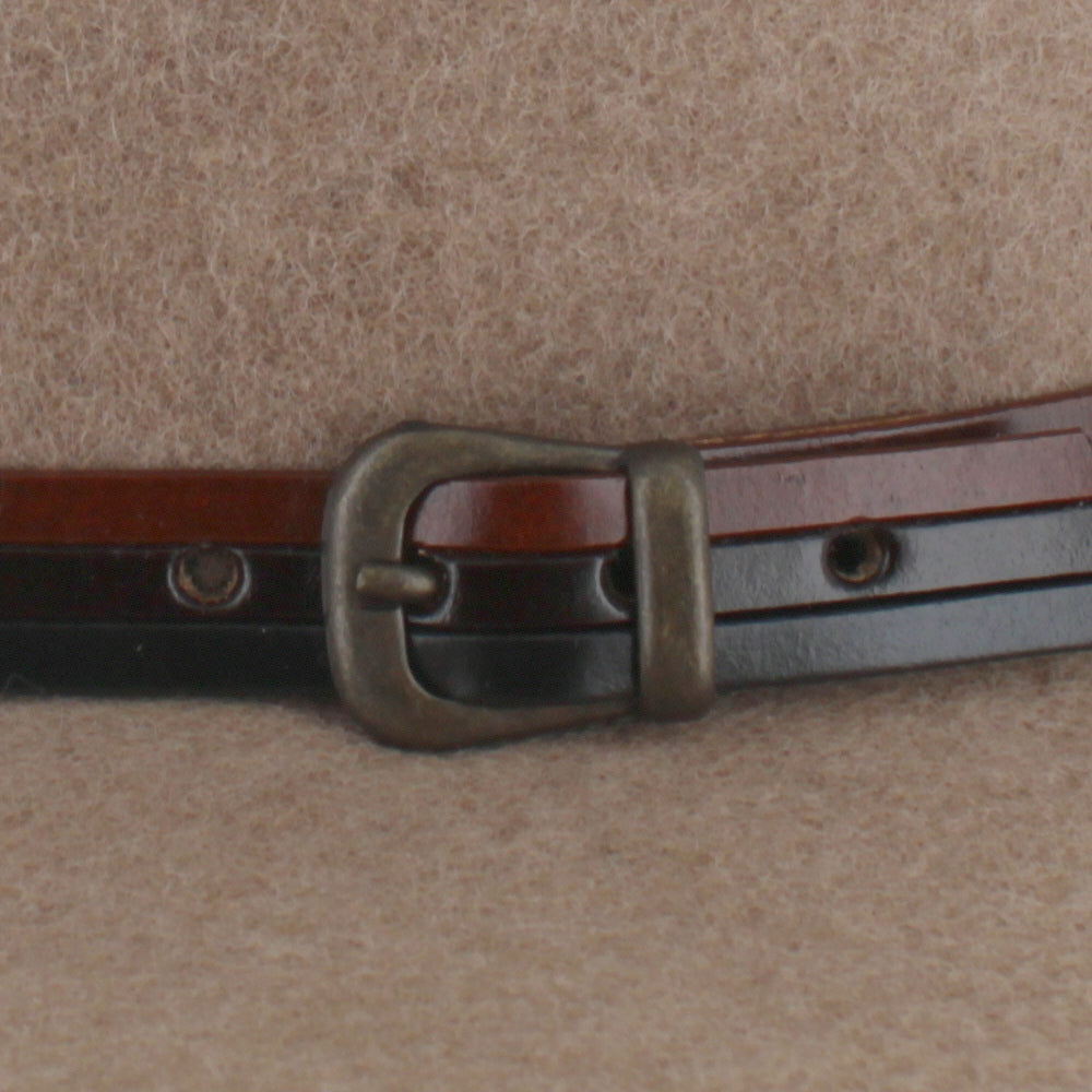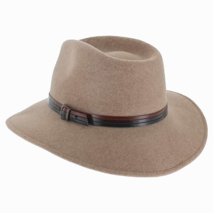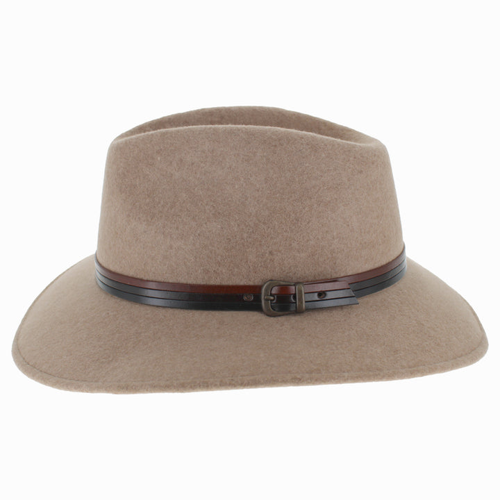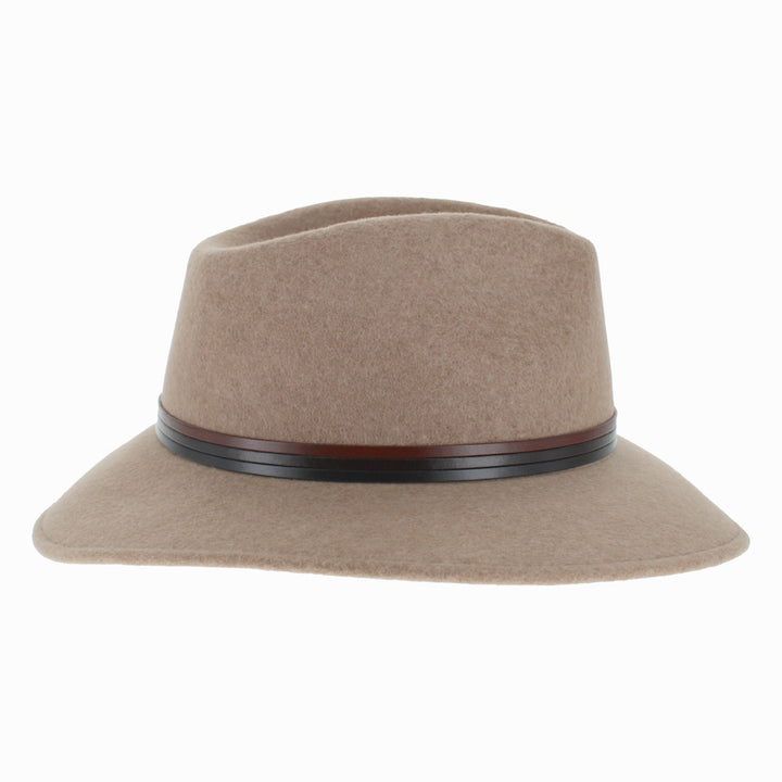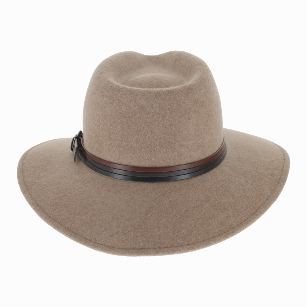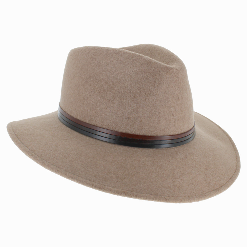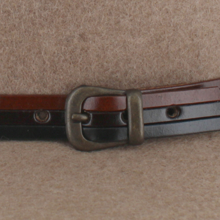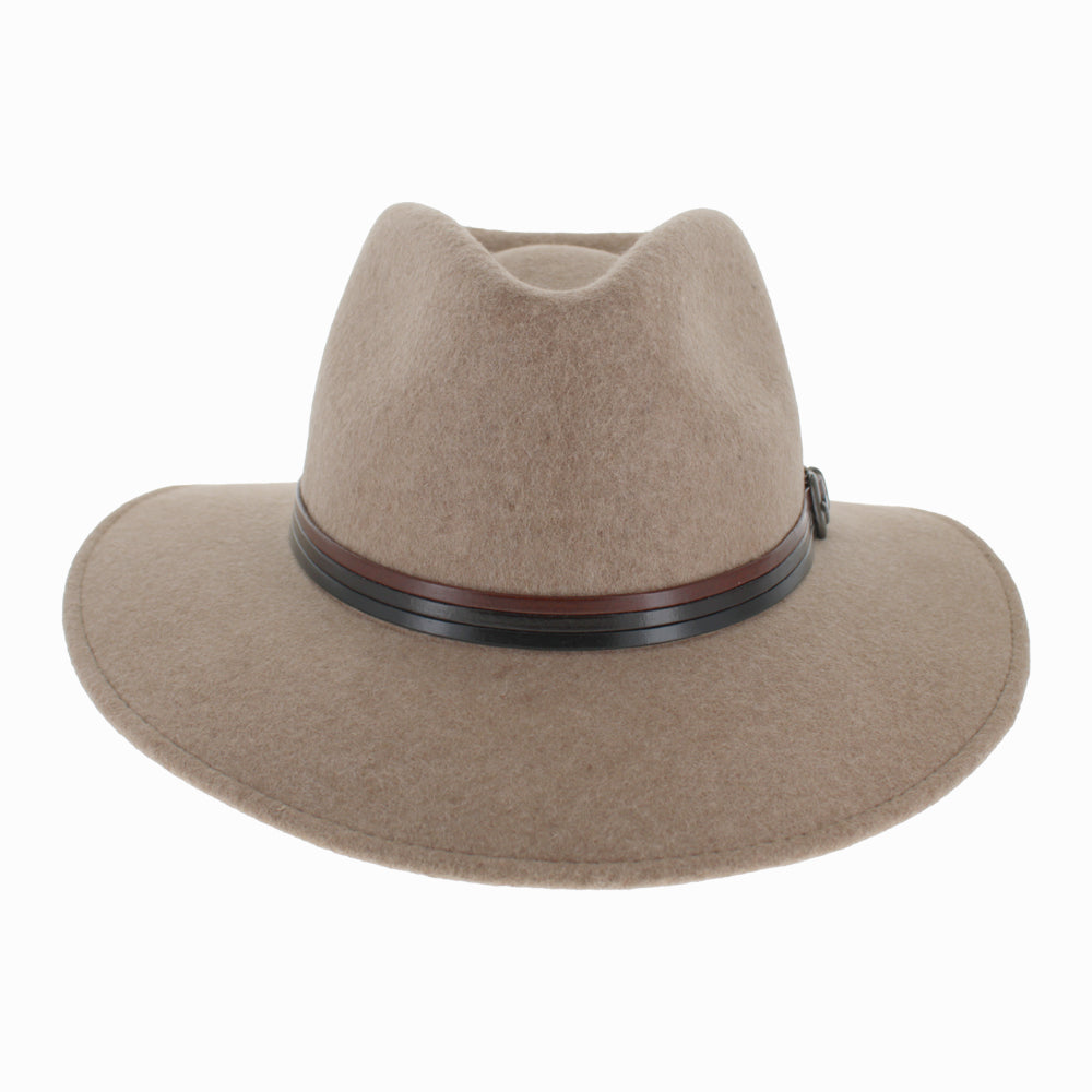 Light taupe safari-style wool hat with tri-tone leather band, designed for summer explorers
