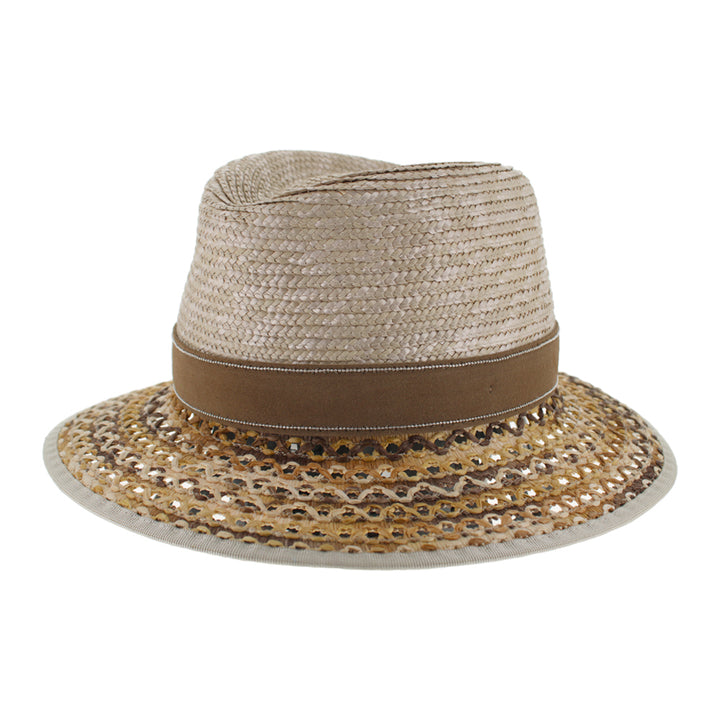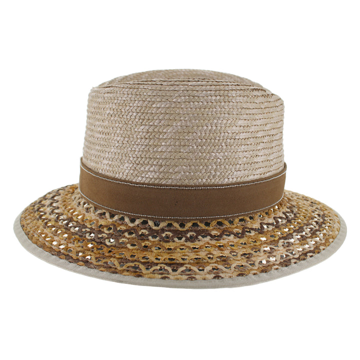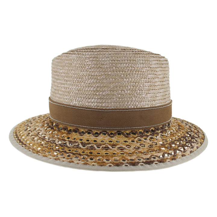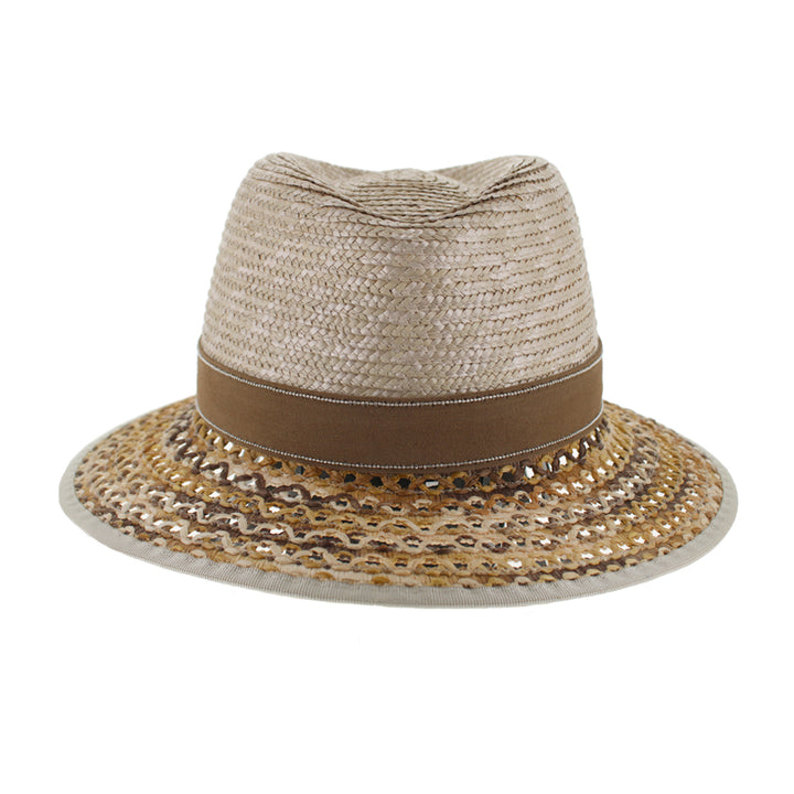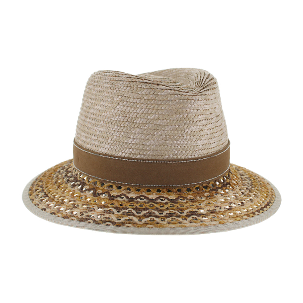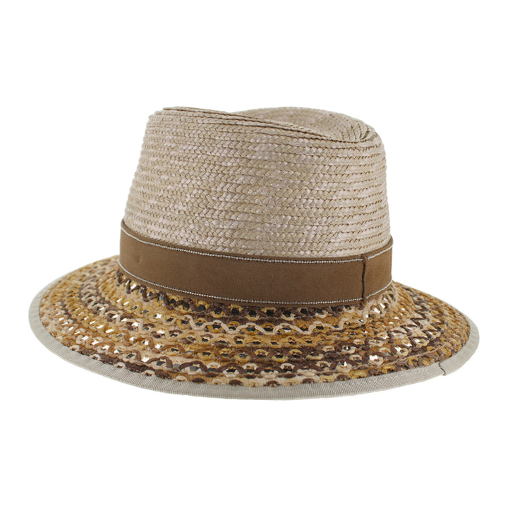 Effortlessly stylish, the Belfry Silva exceeds the limits of Italian design. The oval teardrop crown is tightly woven of paper braid straw and is surrounded by a suede hat band with fine gold beaded trim. The brim is edged with grosgrain ribbon and features an open weave of multi-colored raffia straw. This stellar safari hat is designed by Ferruccio Vecchi of Italy.