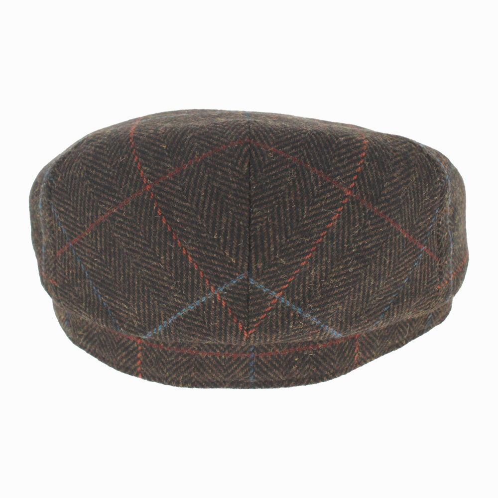 Belfry Jake brown herringbone flat cap, lined interior with plaid windowpane design