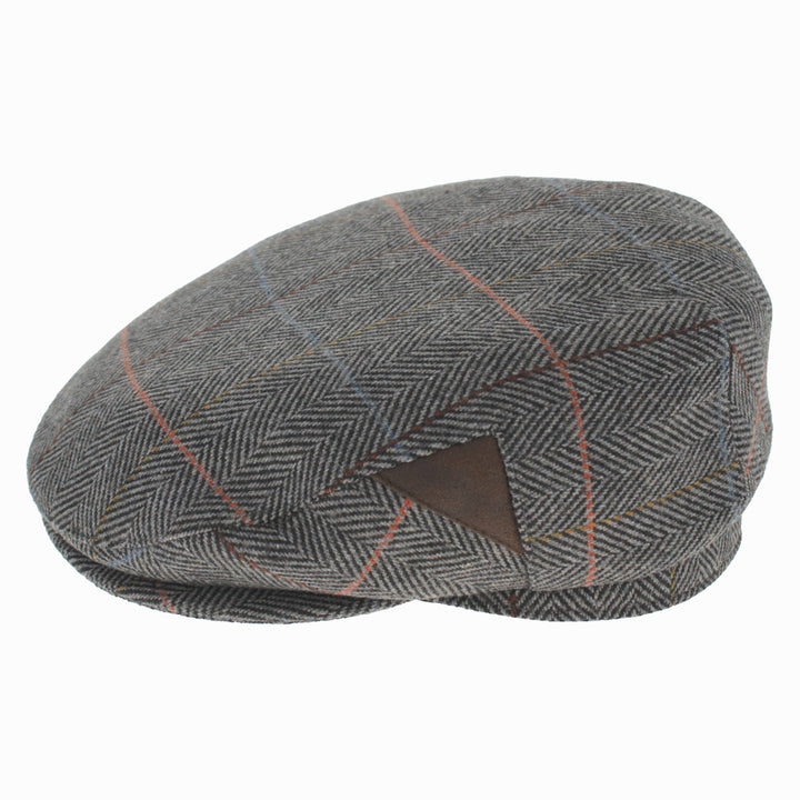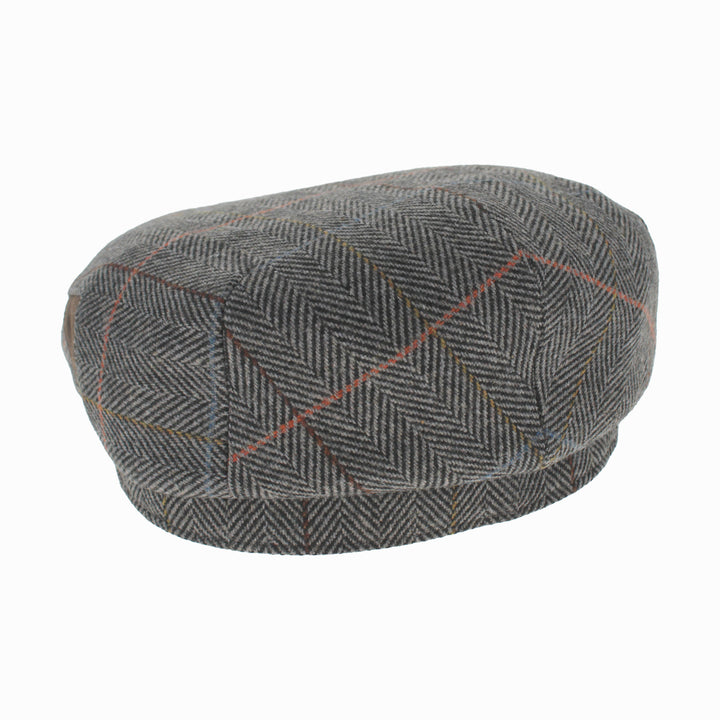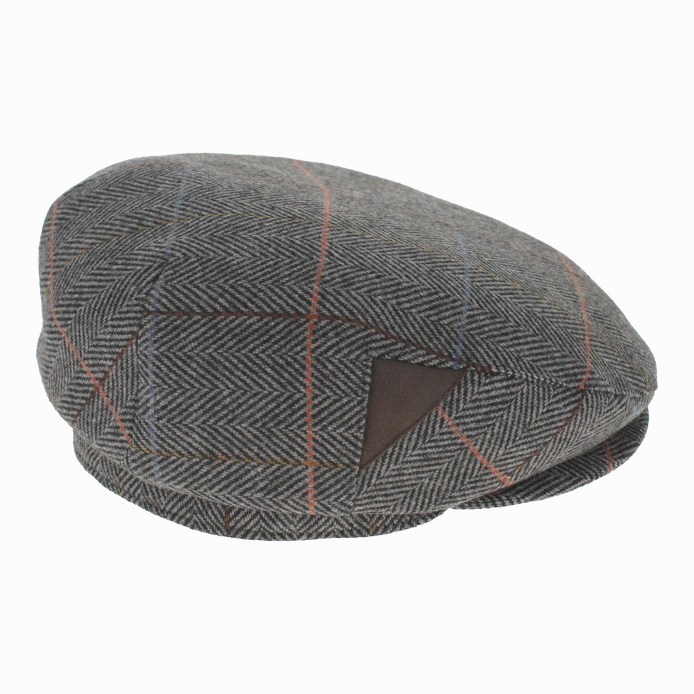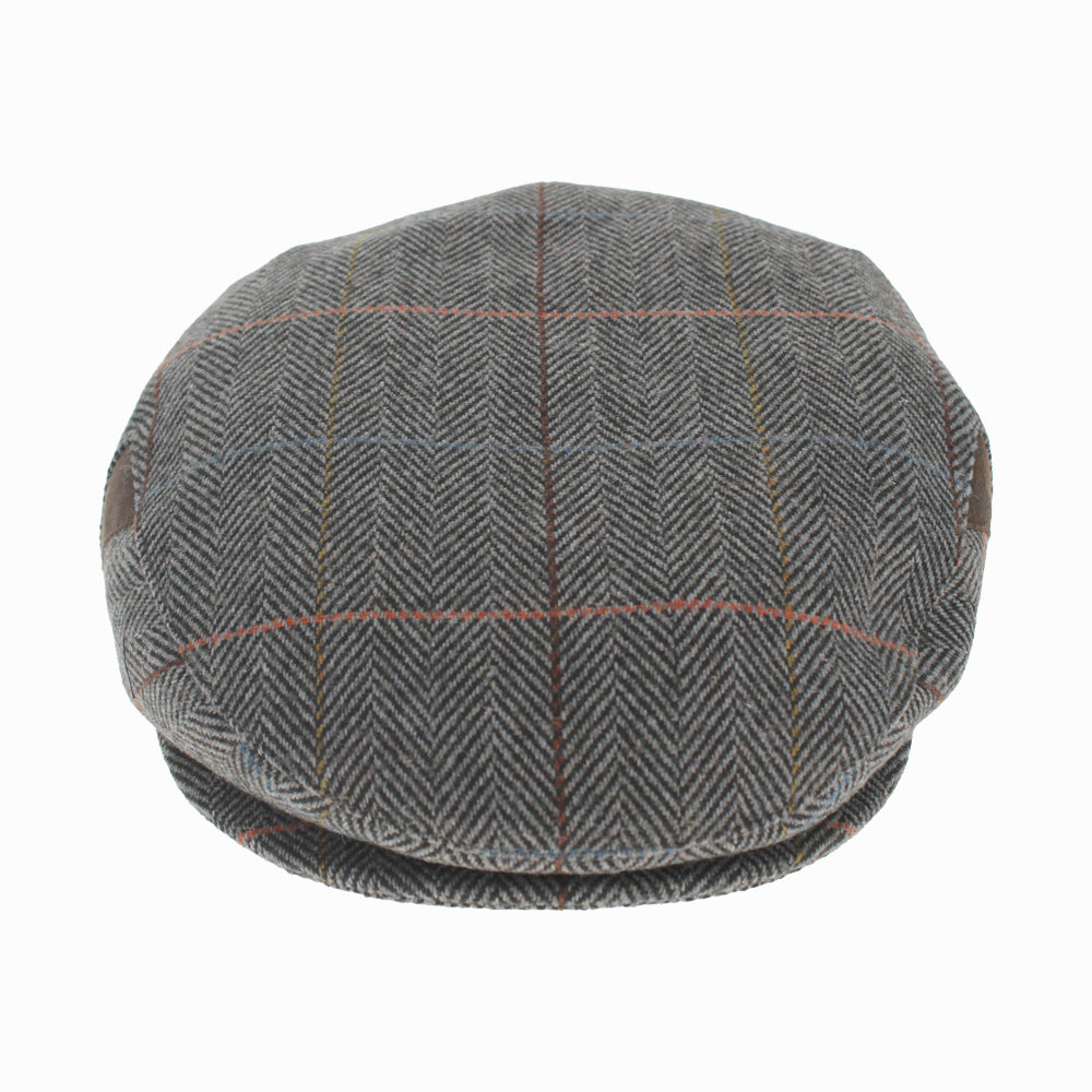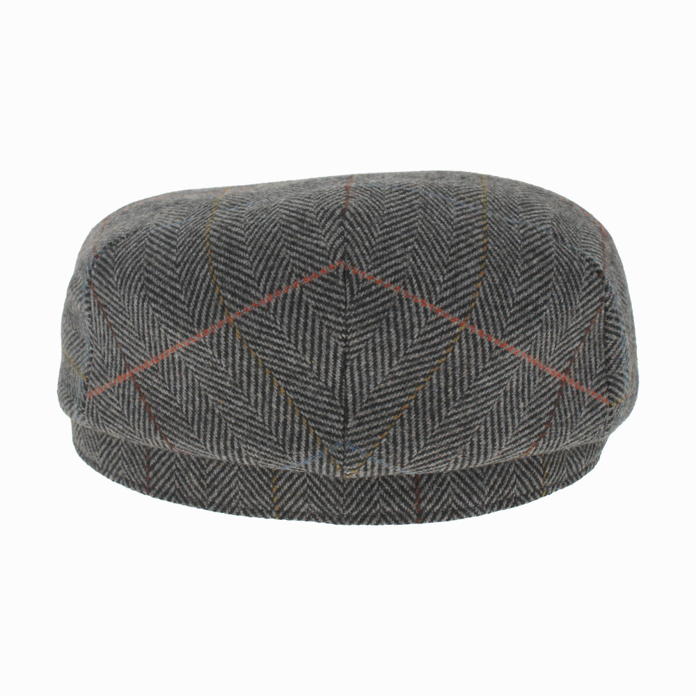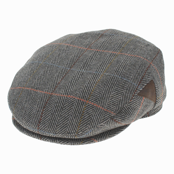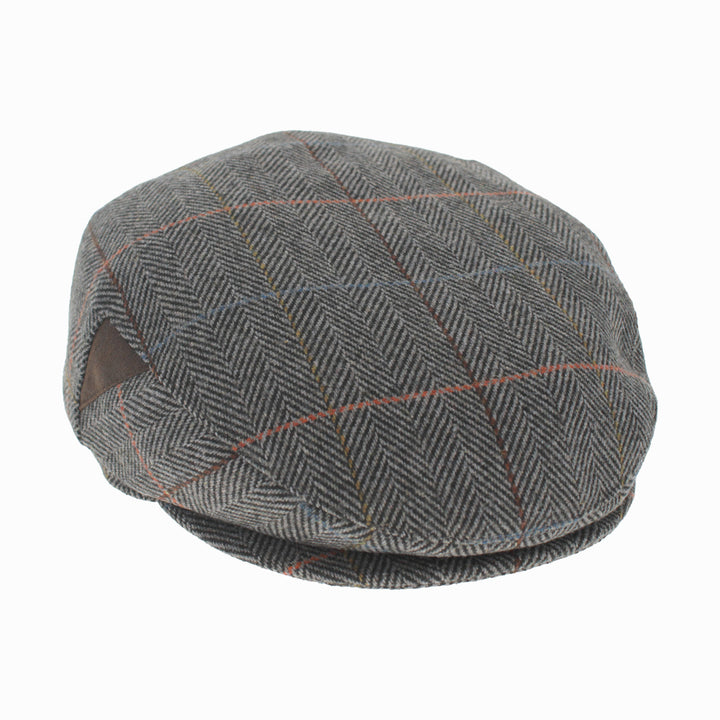 Belfry Jake grey herringbone flat cap, lined cold-weather accessory with plaid overlay