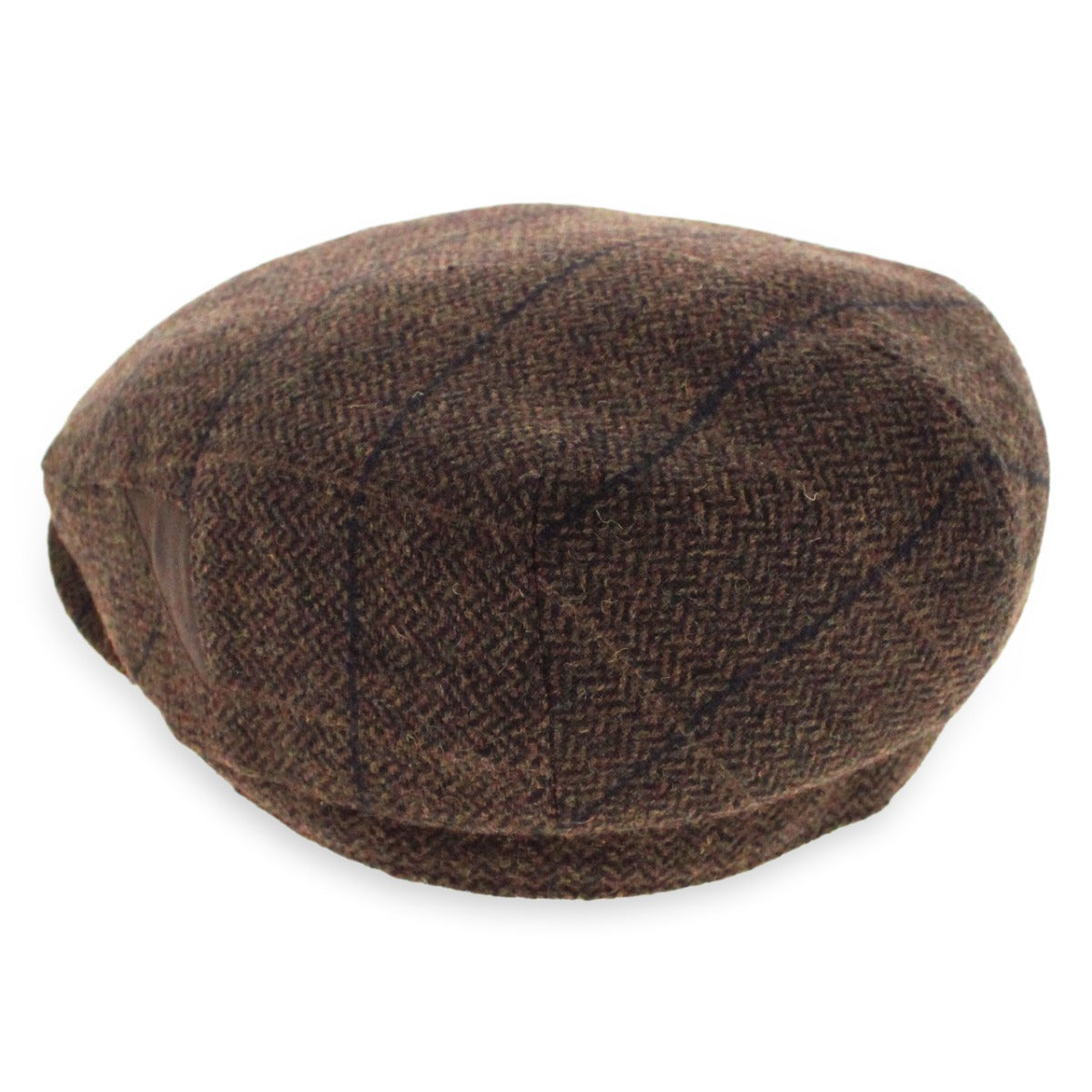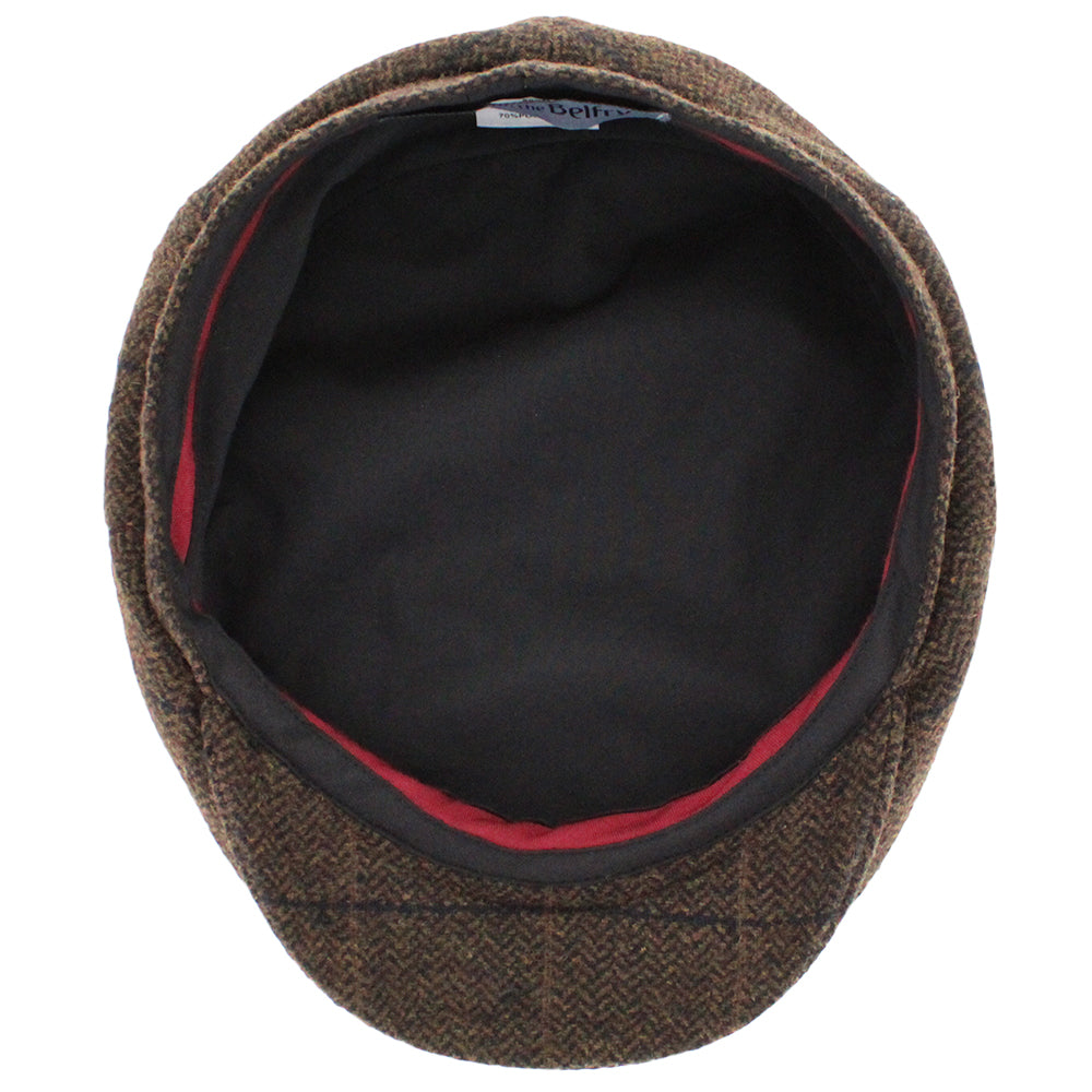 Belfry Jake brown plaid wool flat cap, comfortable lined interior with ribbon band