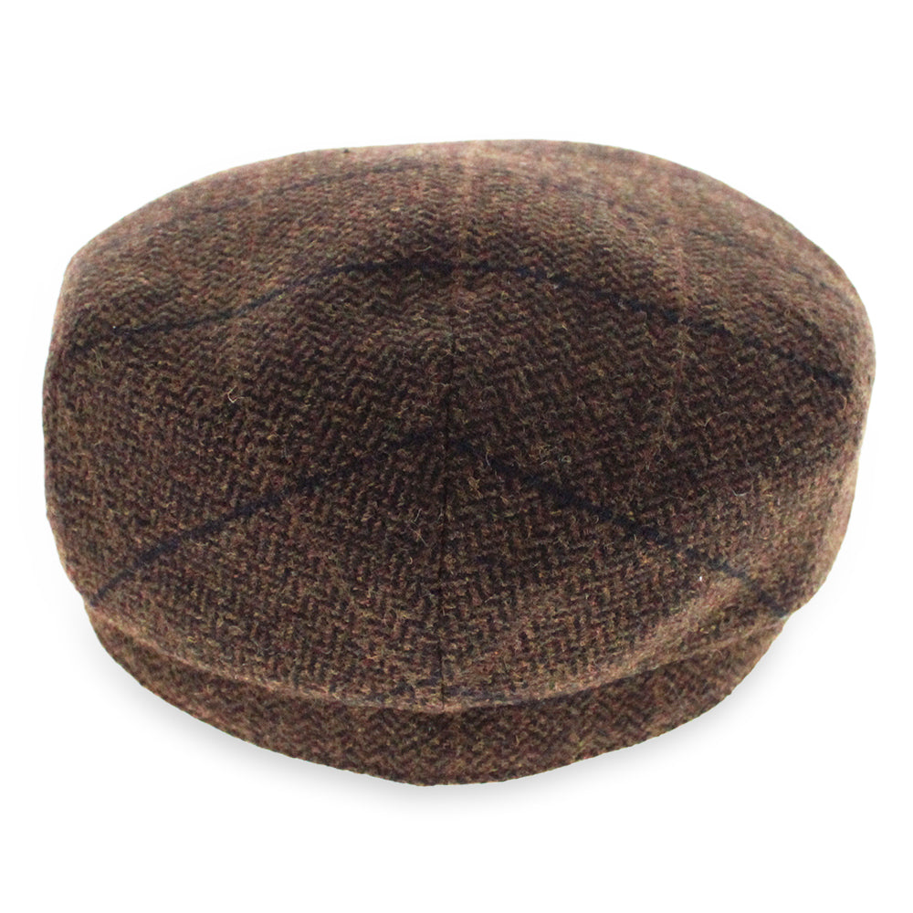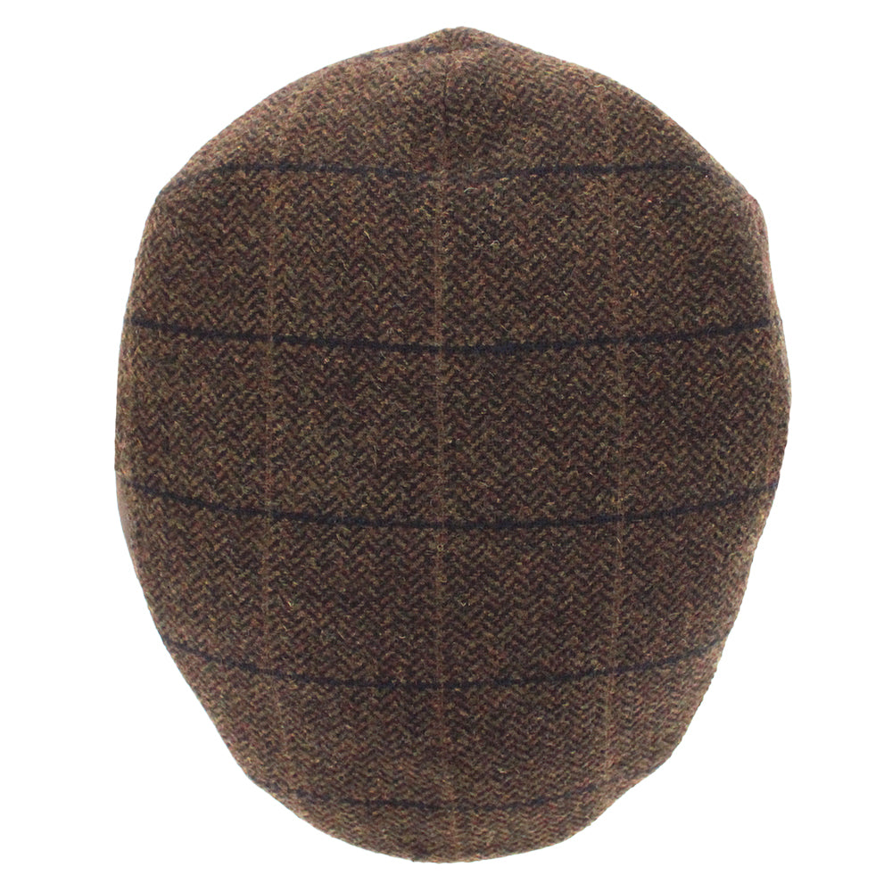 Belfry Jake brown herringbone flat cap, lined interior with plaid windowpane design