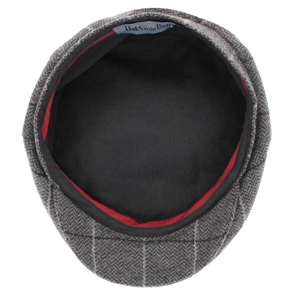 Belfry Jake grey plaid wool flat cap, fully lined interior with ribbon band finish