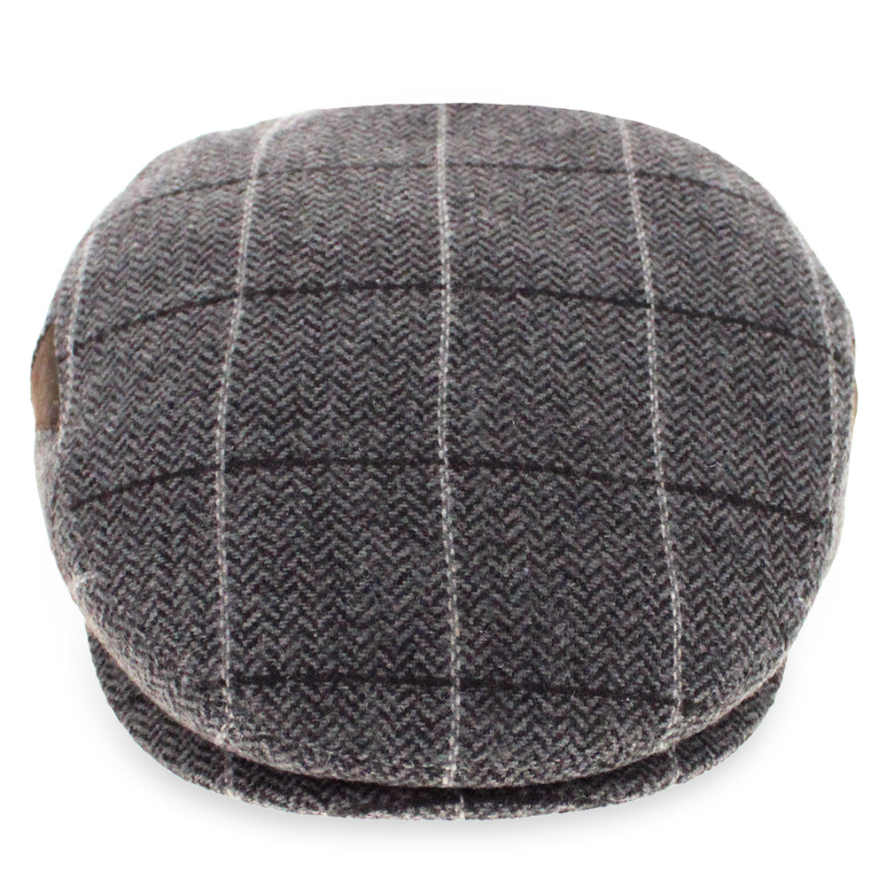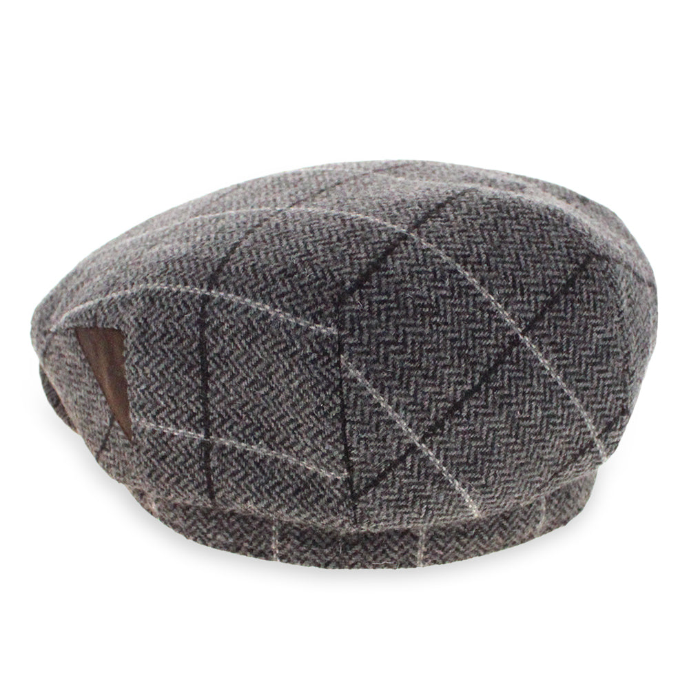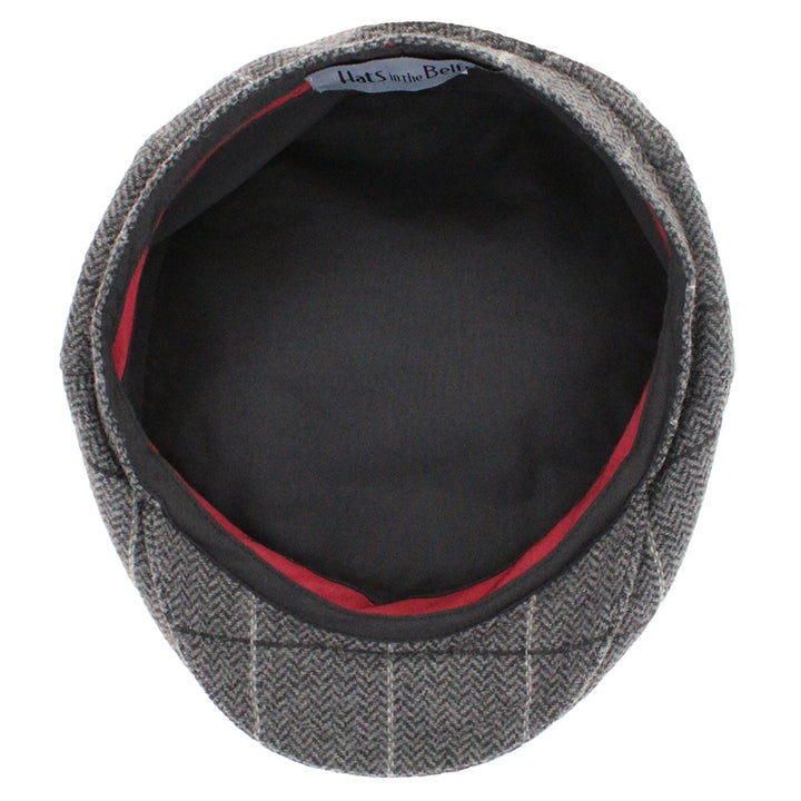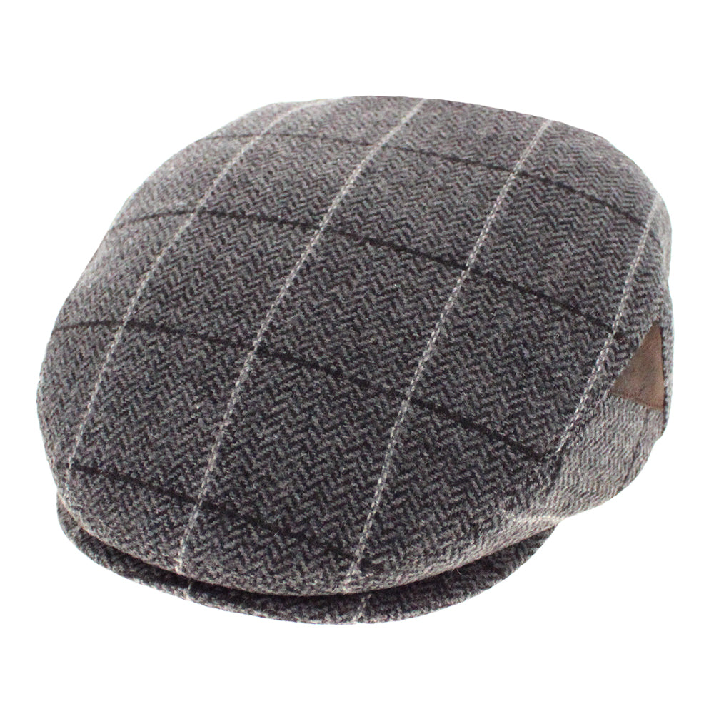 Belfry Jake grey herringbone flat cap, lined cold-weather accessory with plaid overlay