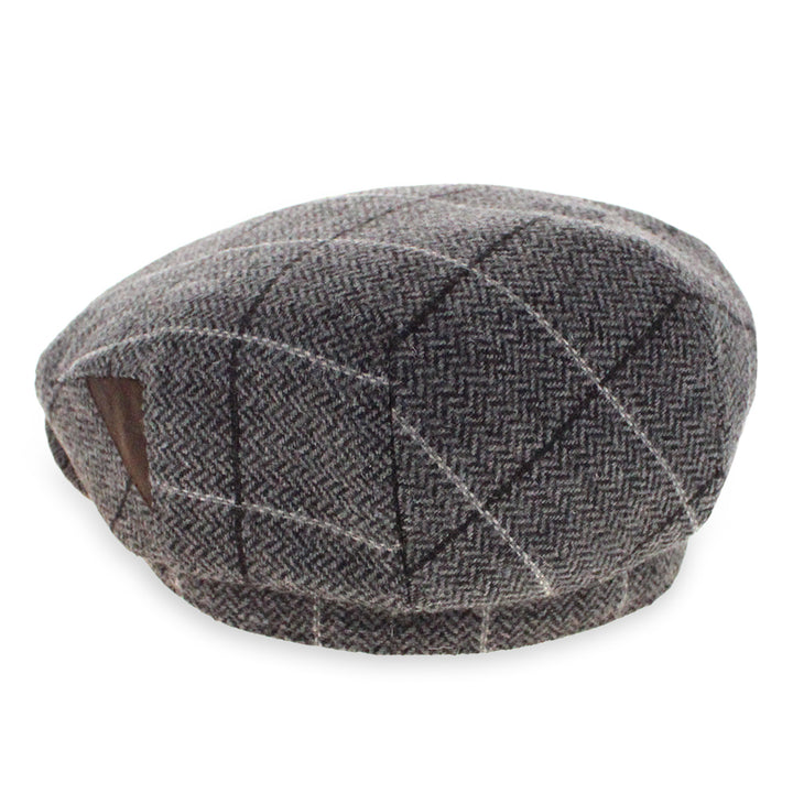 The Belfry Jake is a modern flat cap made of a soft mid-weight polyester/wool blend. It features a herringbone pattern overlaid with a windowpane plaid. The interior is fully lined and offers a wide grosgrain ribbon inner band for an added layer of comfort.