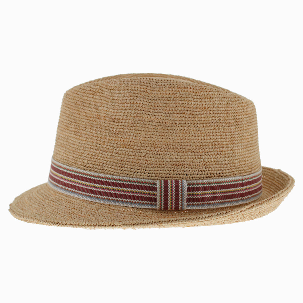 Crocheted raffia trilby in neutral striped tones, ideal for travel and warm days