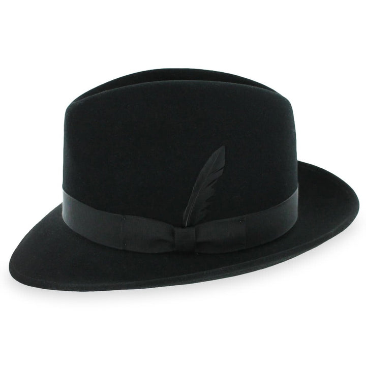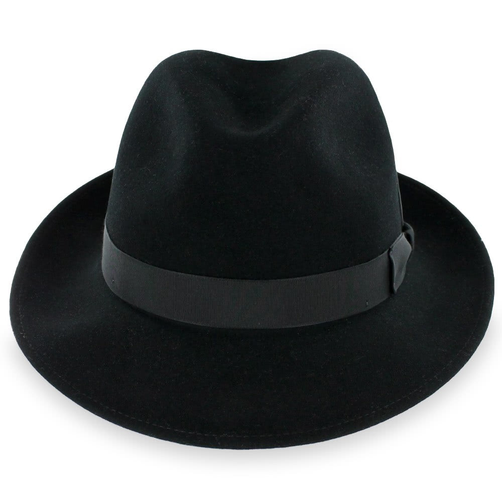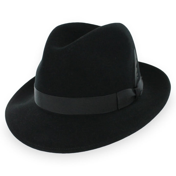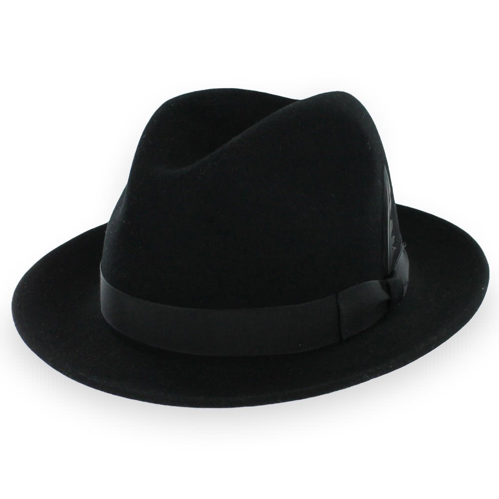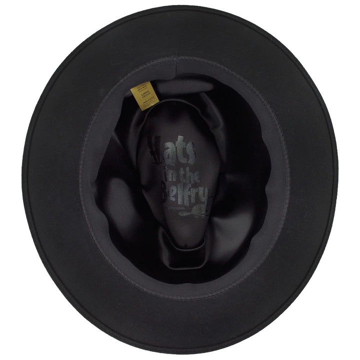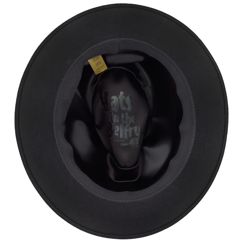 The Belfry Frankie C is classic dress fedora handcrafted of luxurious wool felt with a touch of cashmere, giving it a soft, rich finish. It is accessorized with an elegant grosgrain ribbon hat band and a matching removable feather. The brim may be worn up or down for two different styling options The fully lined interior offers a moisture-wicking German inner band for a comfortable wearing experience.