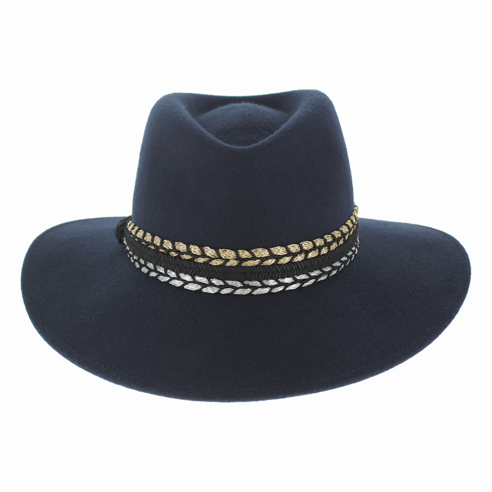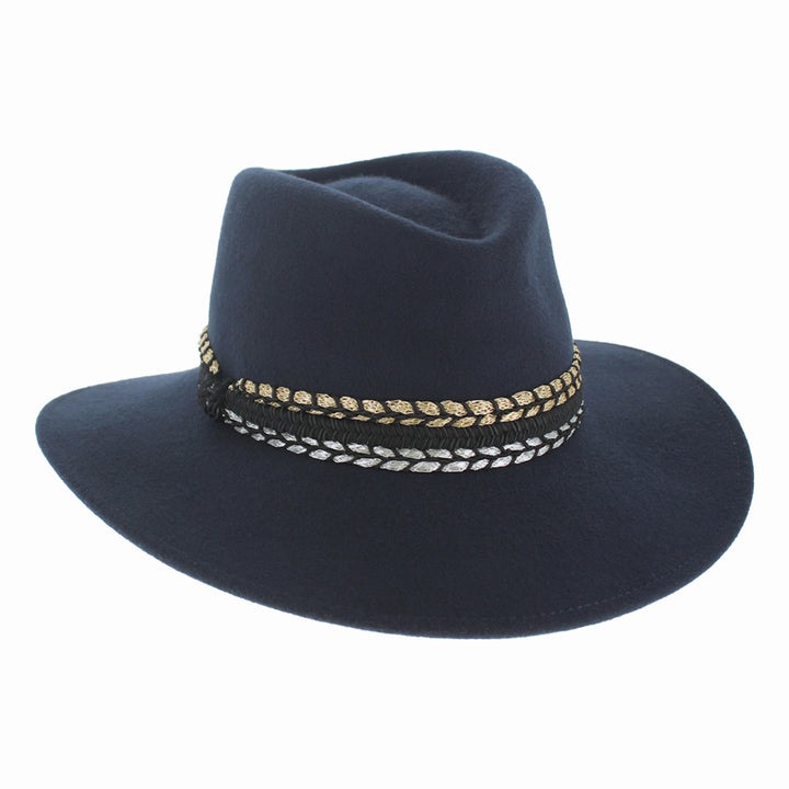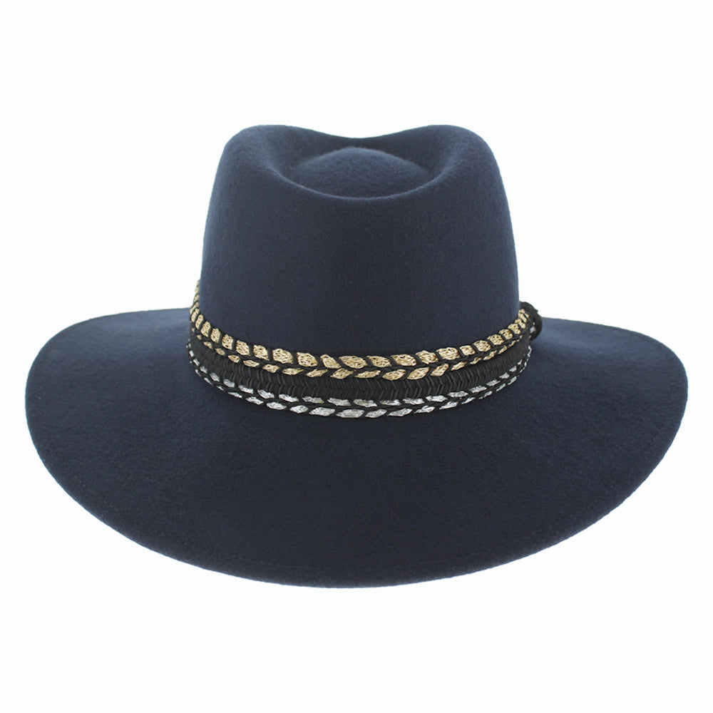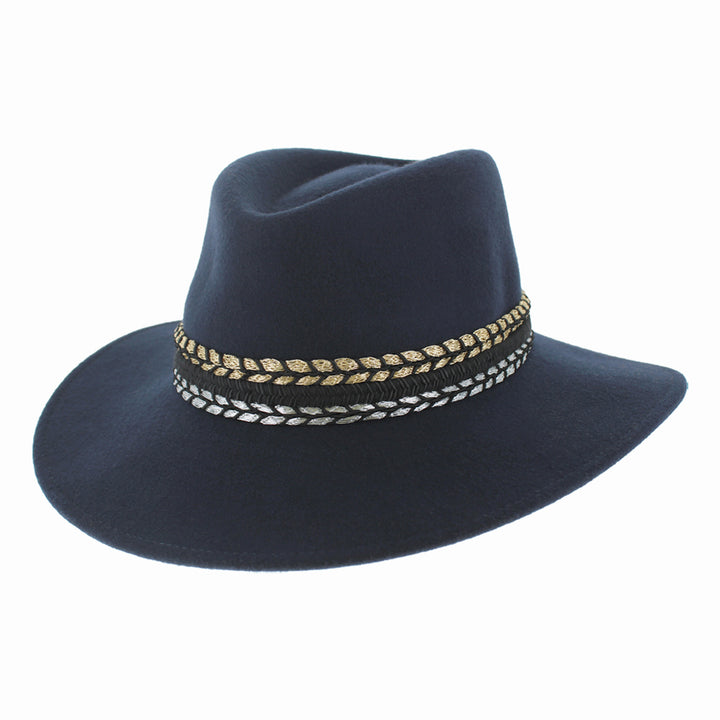 Women’s Luxury Wool Safari Fedora – Elegant Wide Brim Hat with Gold & Silver Accent Band – Stylish Wool Fedora for Fall and Winter