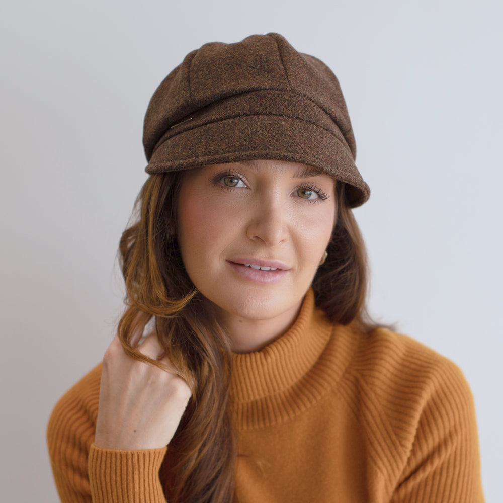 Angled shot of Edda brown mod cap featuring button top and clean 8-panel design