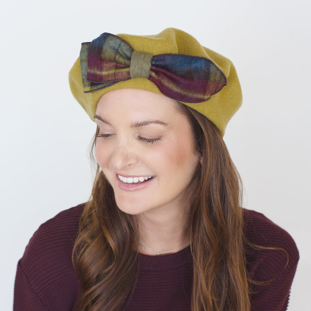 Belfry Berretto Muchino wool tam beret with plaid bow accent, handcrafted Italian design