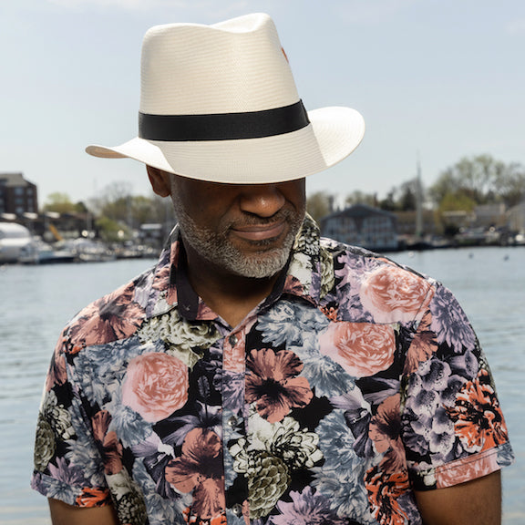 The Belfry Arnold is a safari style made of a smooth shantung straw. The body of the Arnold is woven in a a 2X2 herringbone pattern and has been treated with a Teflon coating to help repel moisture and stains. A grosgrain hat band wraps smoothly around the teardrop crown and is finished off with a removable feather.