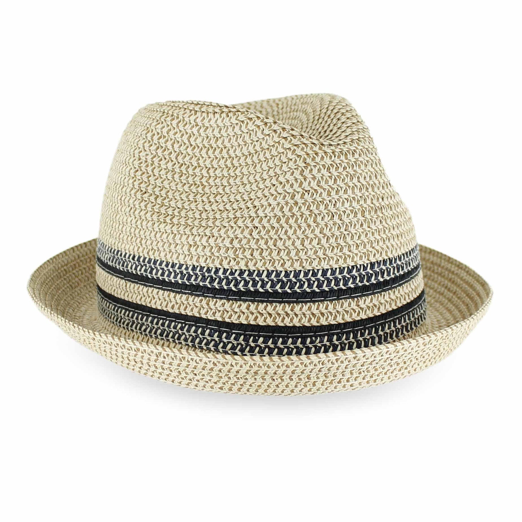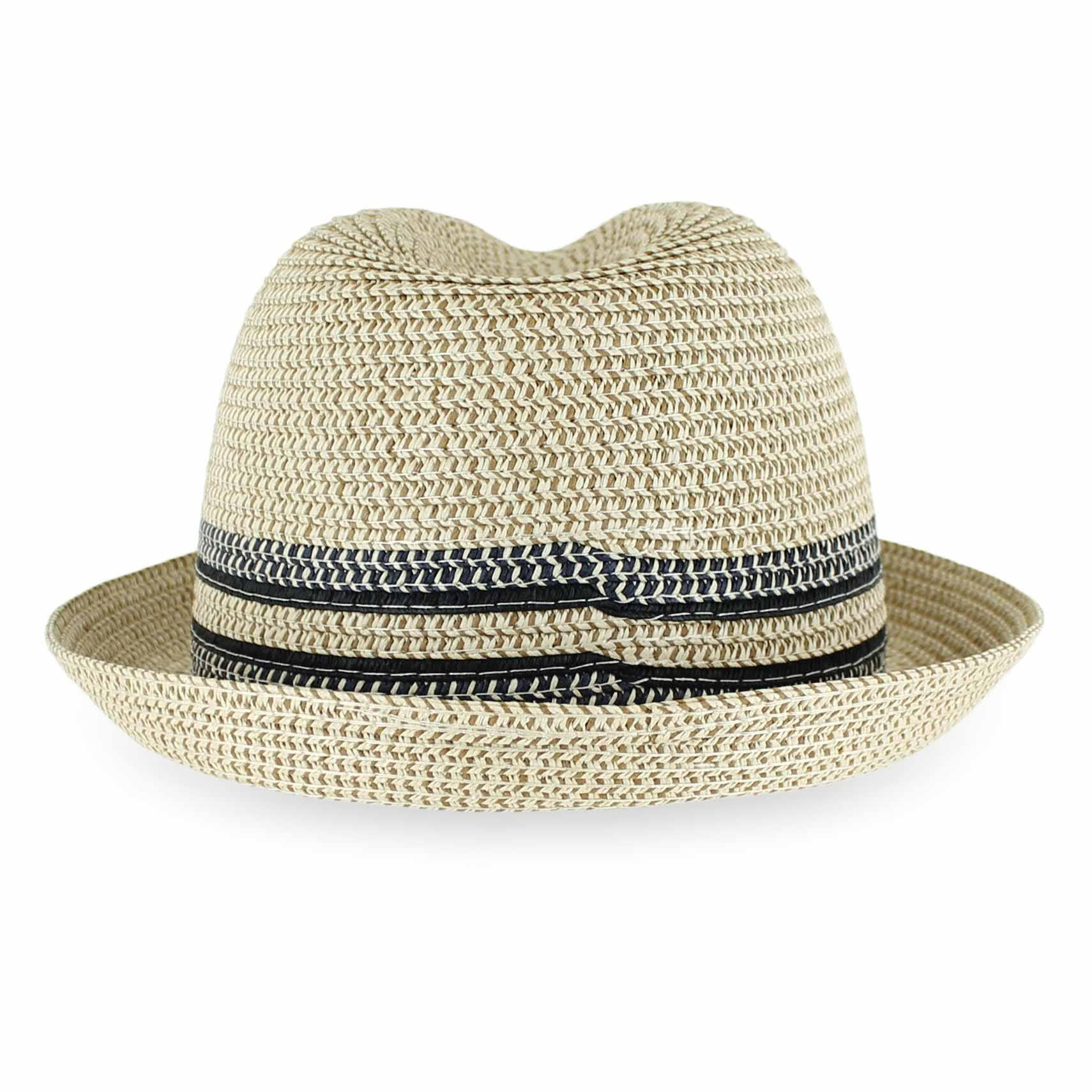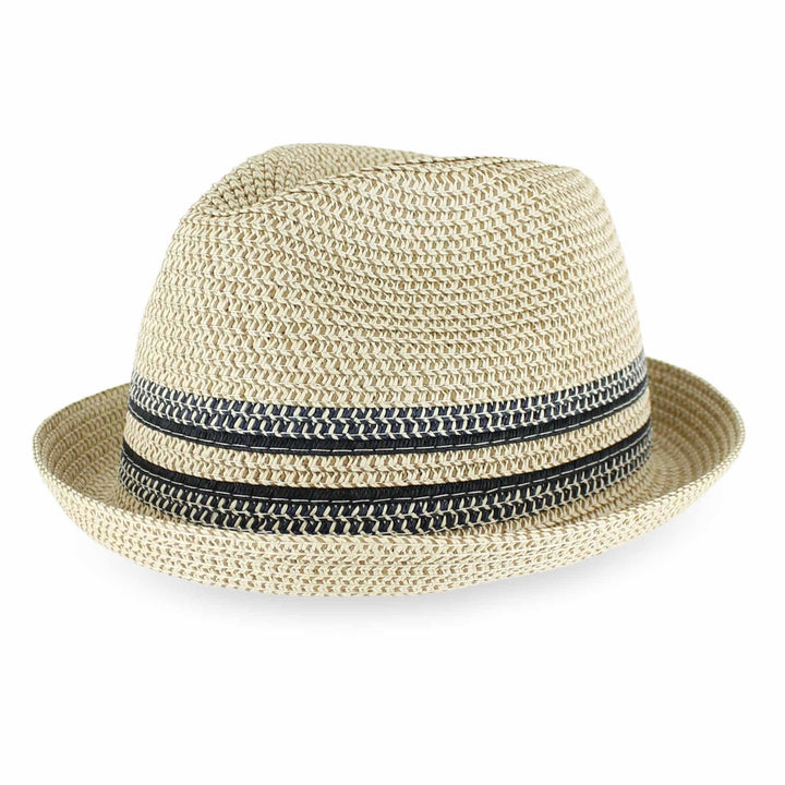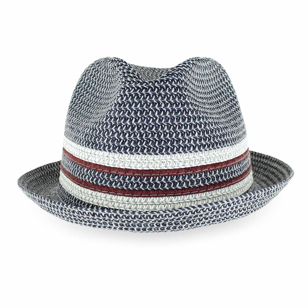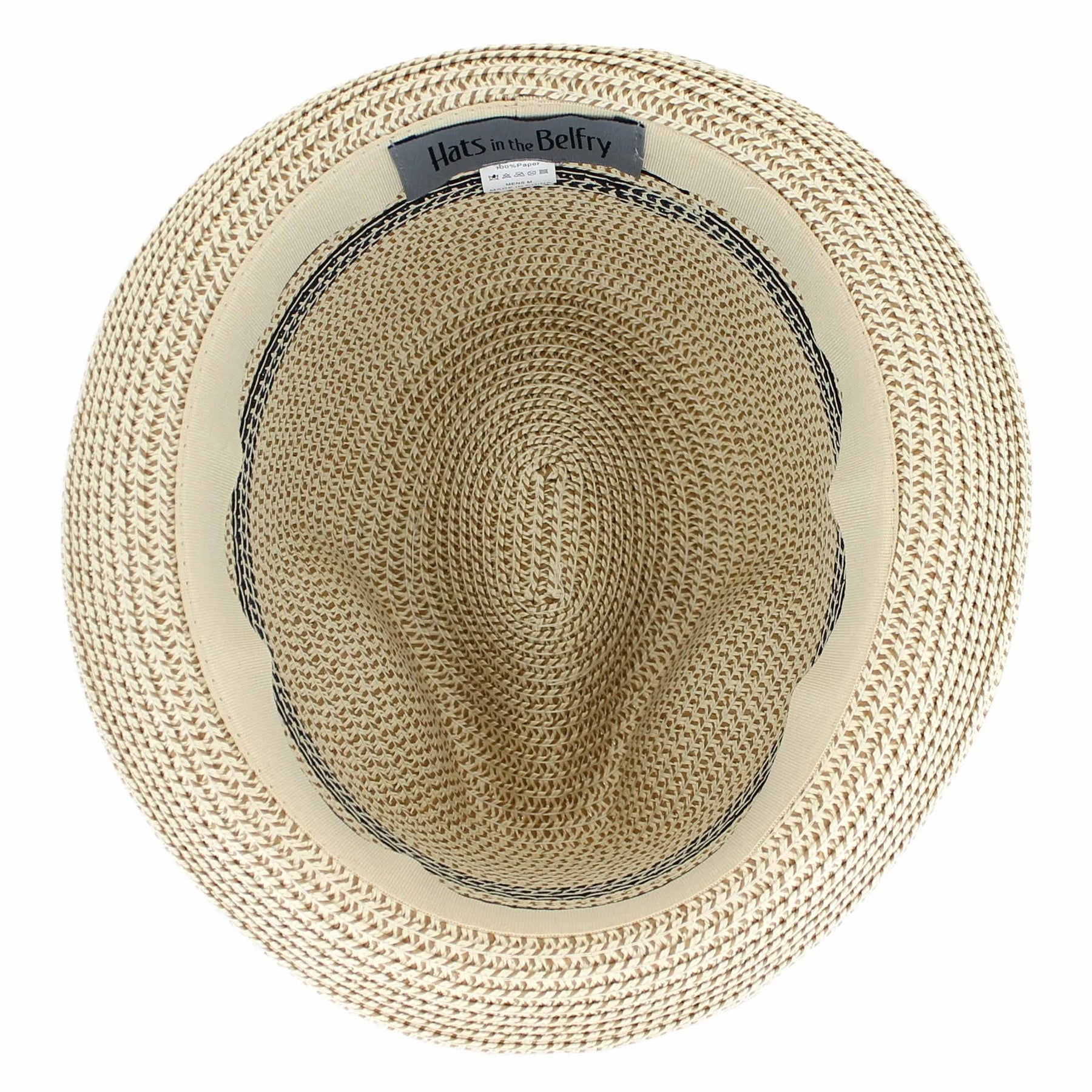 Navy/grey Belfry Dax fedora with pinch front, durable braided straw, and stingy brim—retains shape for packing