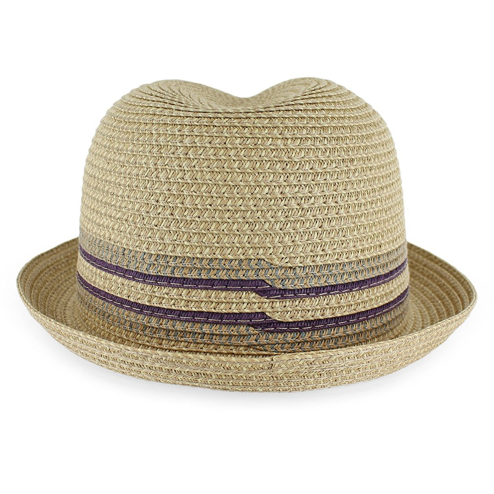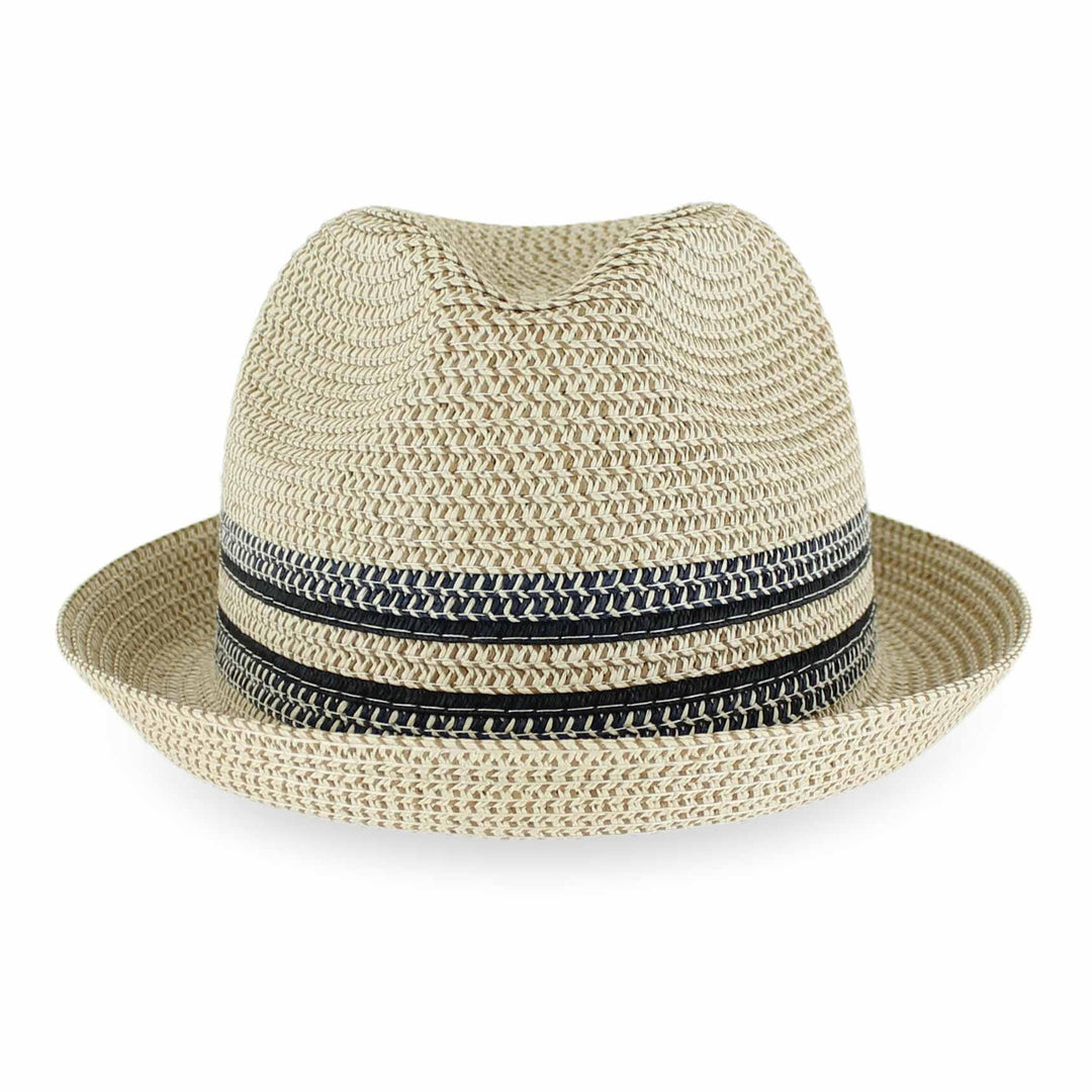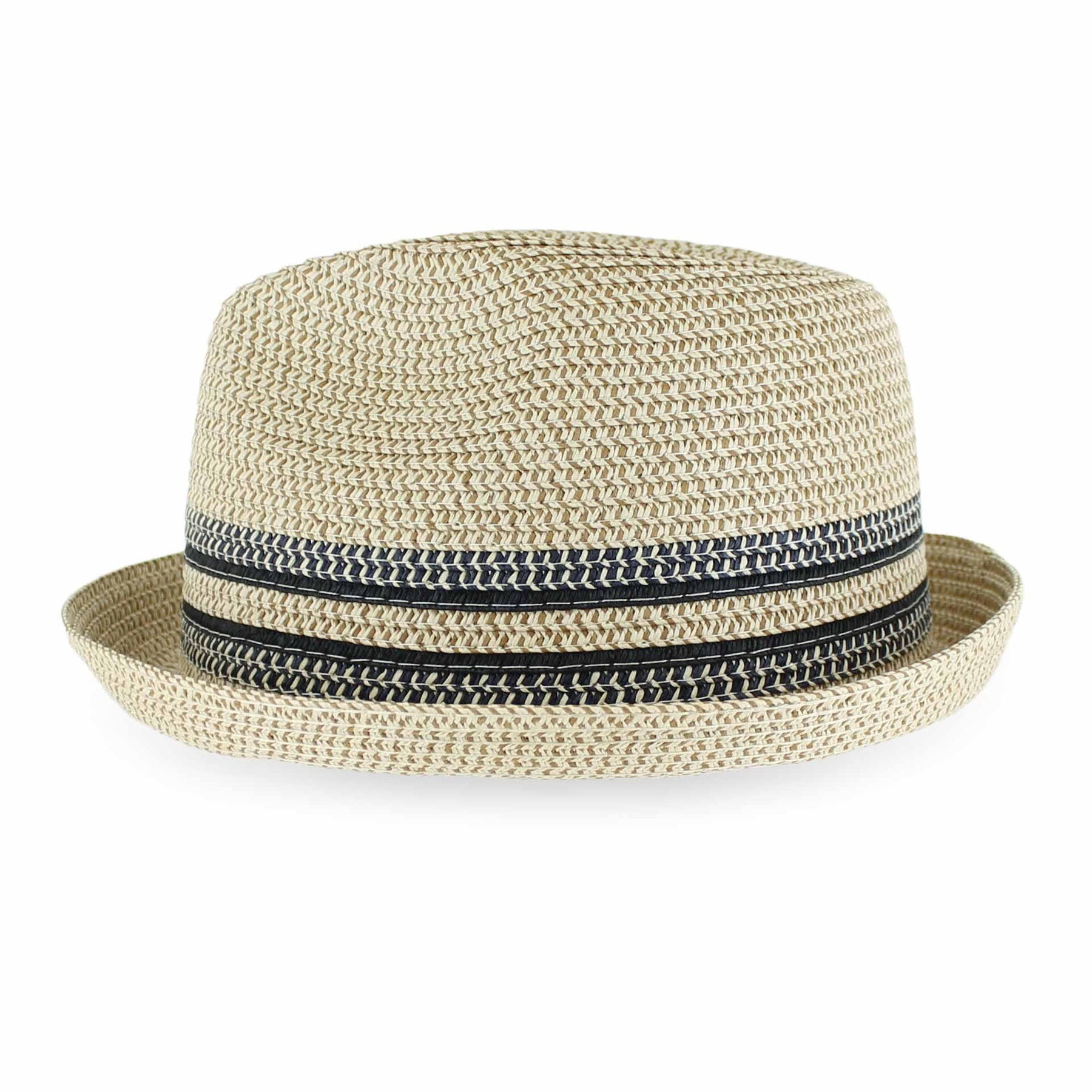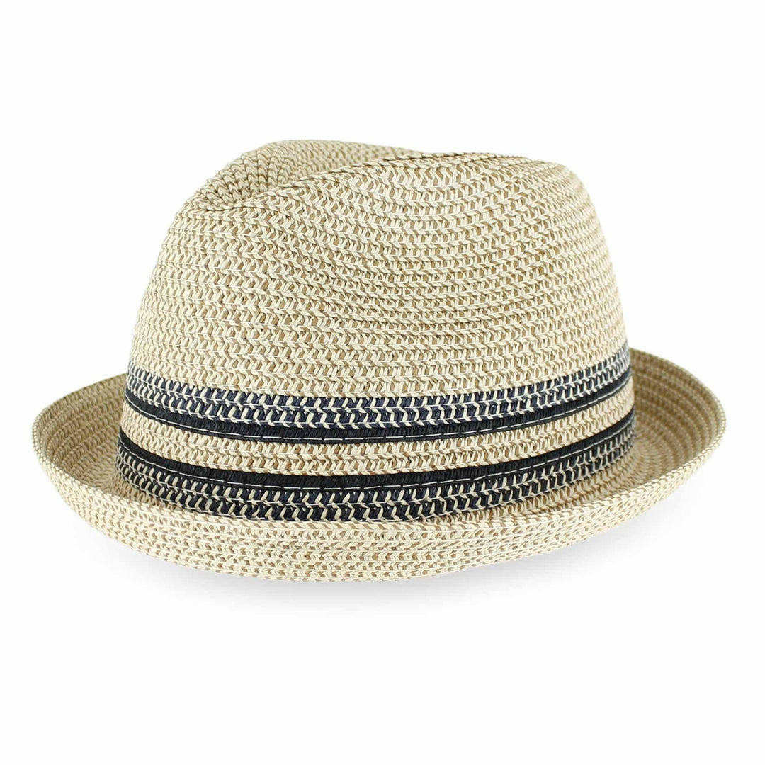 Navy/grey Belfry Dax fedora with pinch front, durable braided straw, and stingy brim—retains shape for packing