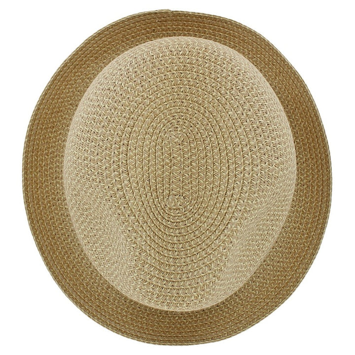Two-tone black and navy paper straw fedora, stingy brim, shape-retaining crown for travel-friendly summer use