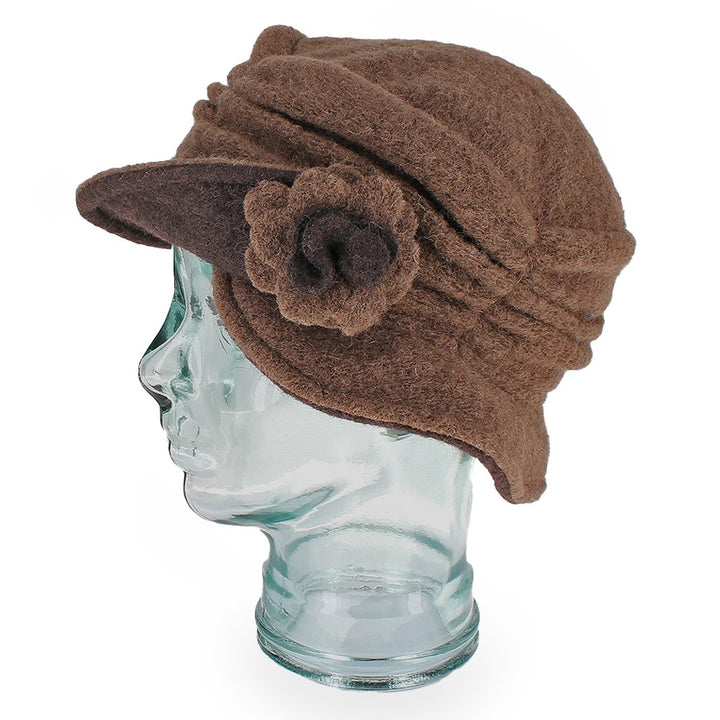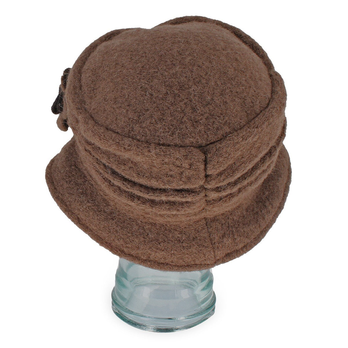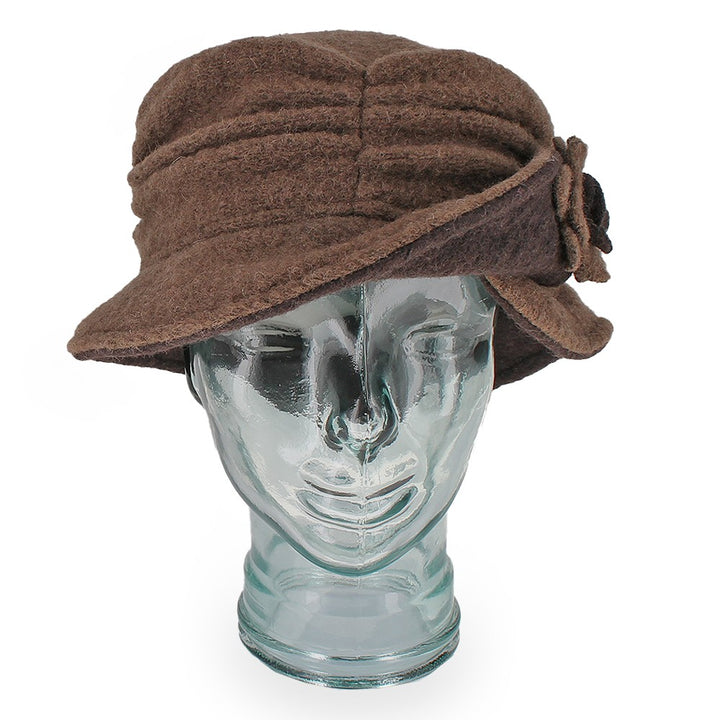 Belfry Gioia taupe cloche-inspired bucket hat with hand-cut flower accent, wool-polyester blend warmth, and elegant rolled brim, a refined piece for cold-weather wardrobes