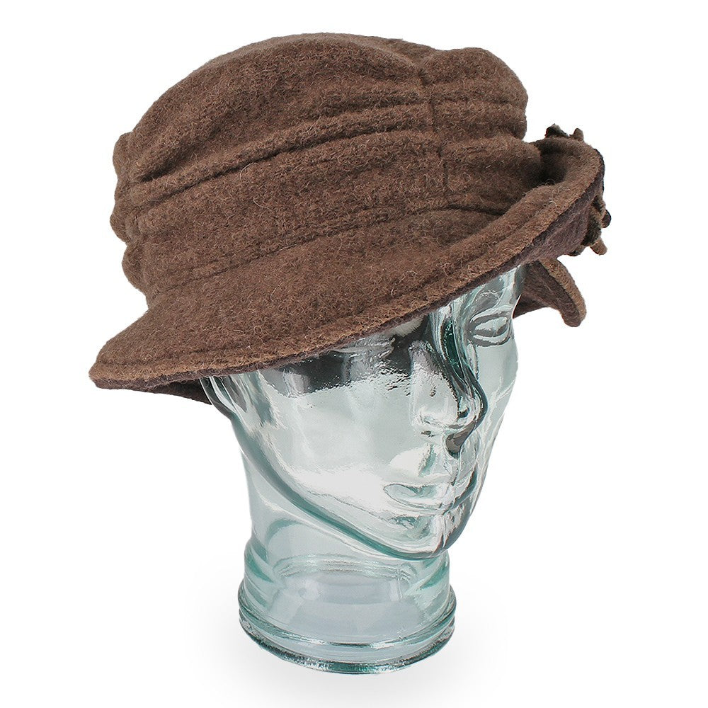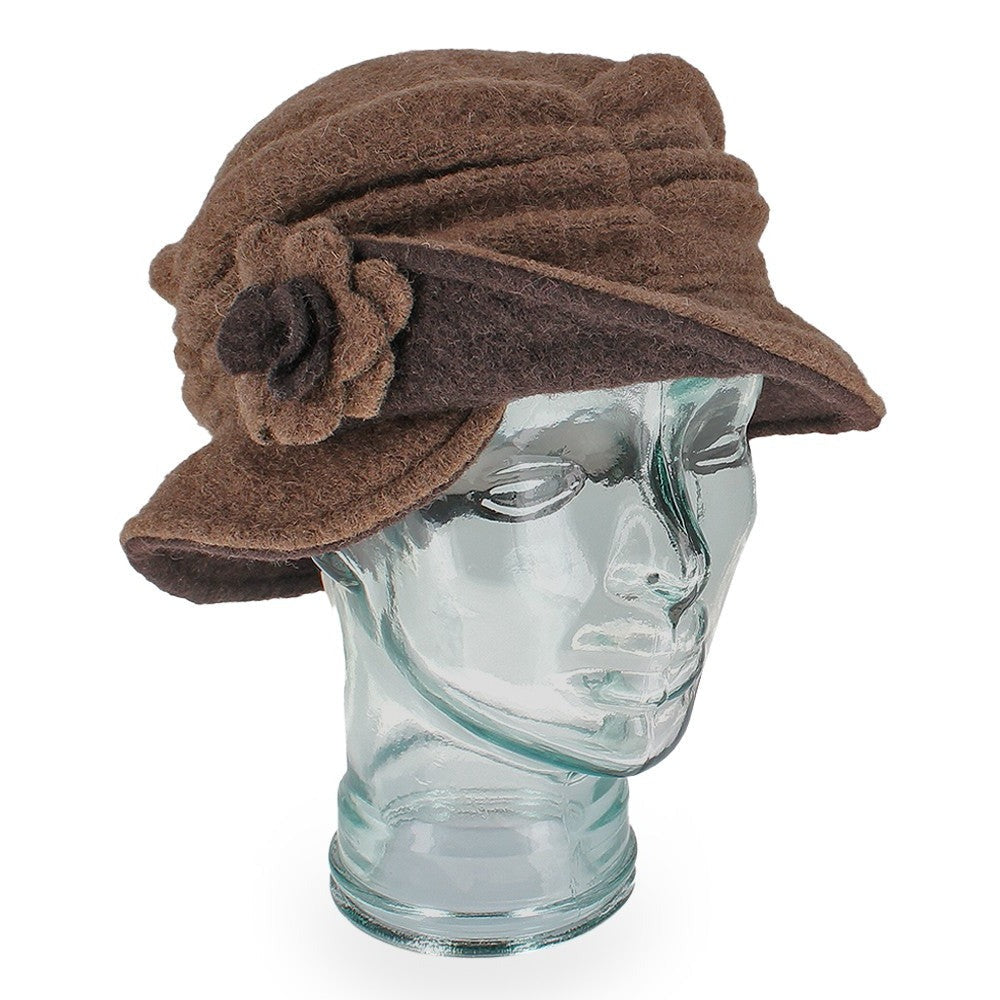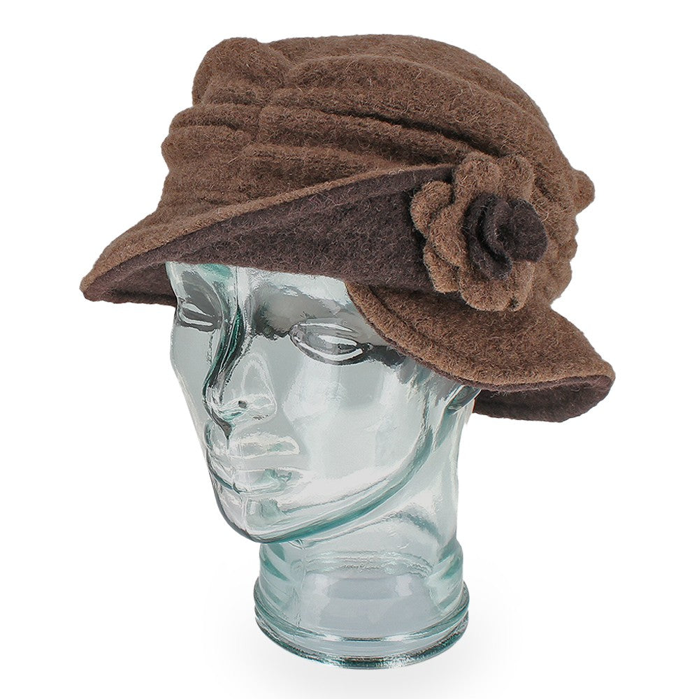 Belfry Gioia taupe women’s bucket hat with vintage-inspired 1920s cloche design, ruched crown, asymmetrical rolled brim, and floral detail, crafted for autumn and winter style