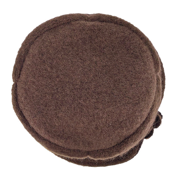 Top view of the Belfry Gioia taupe winter hat featuring its ruched detailing, asymmetrical brim, and feminine silhouette, a fashionable choice for autumn and winter seasons