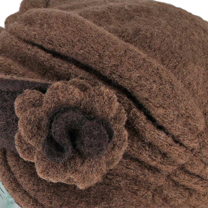 Detailed shot of the Belfry Gioia taupe hat showing its ruched crown, rolled brim, and floral accent, a stylish winter accessory blending vintage charm with modern appeal