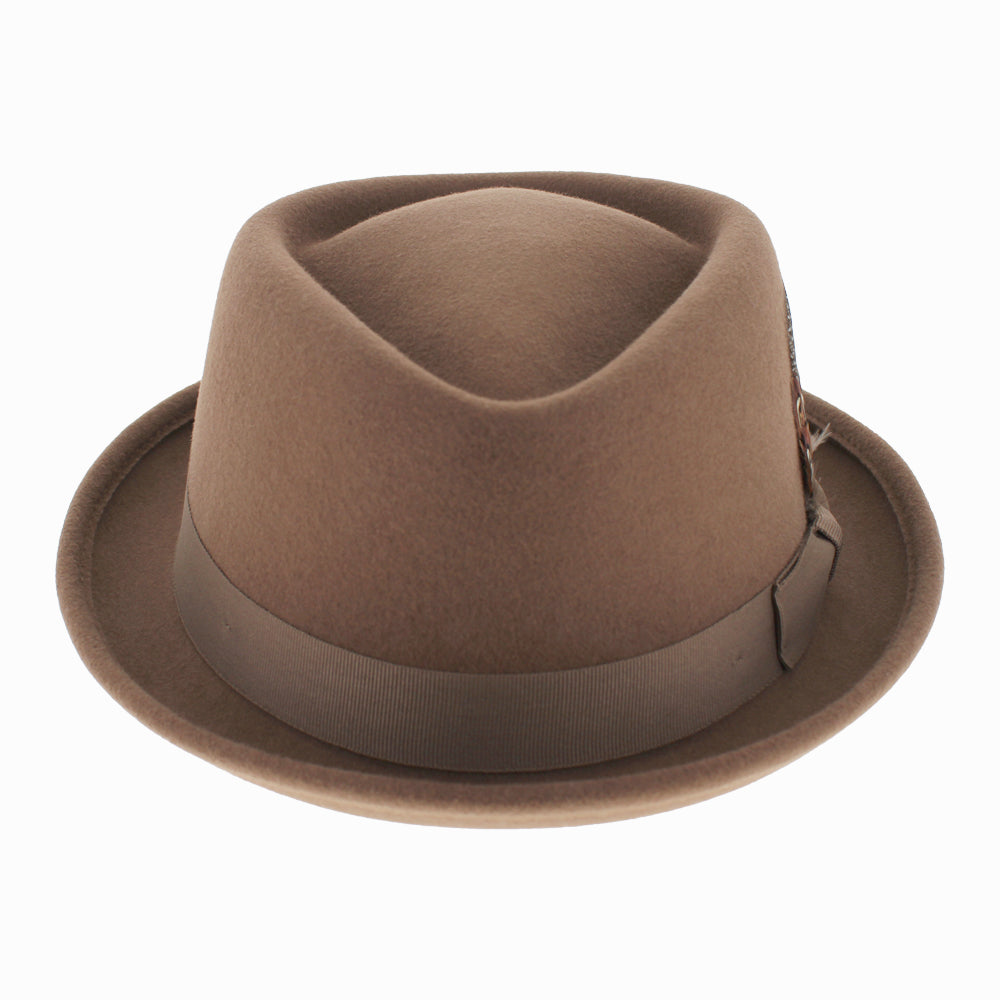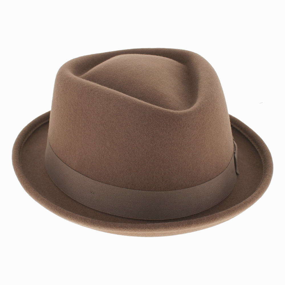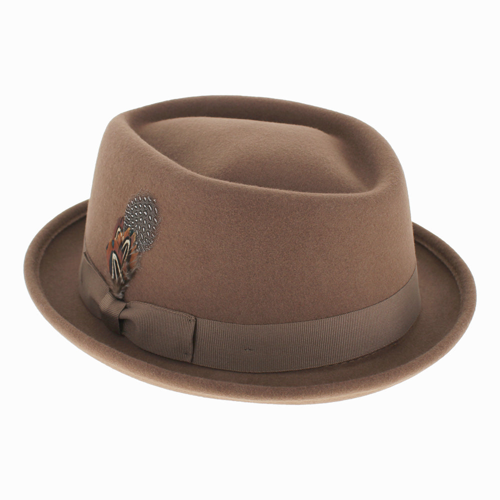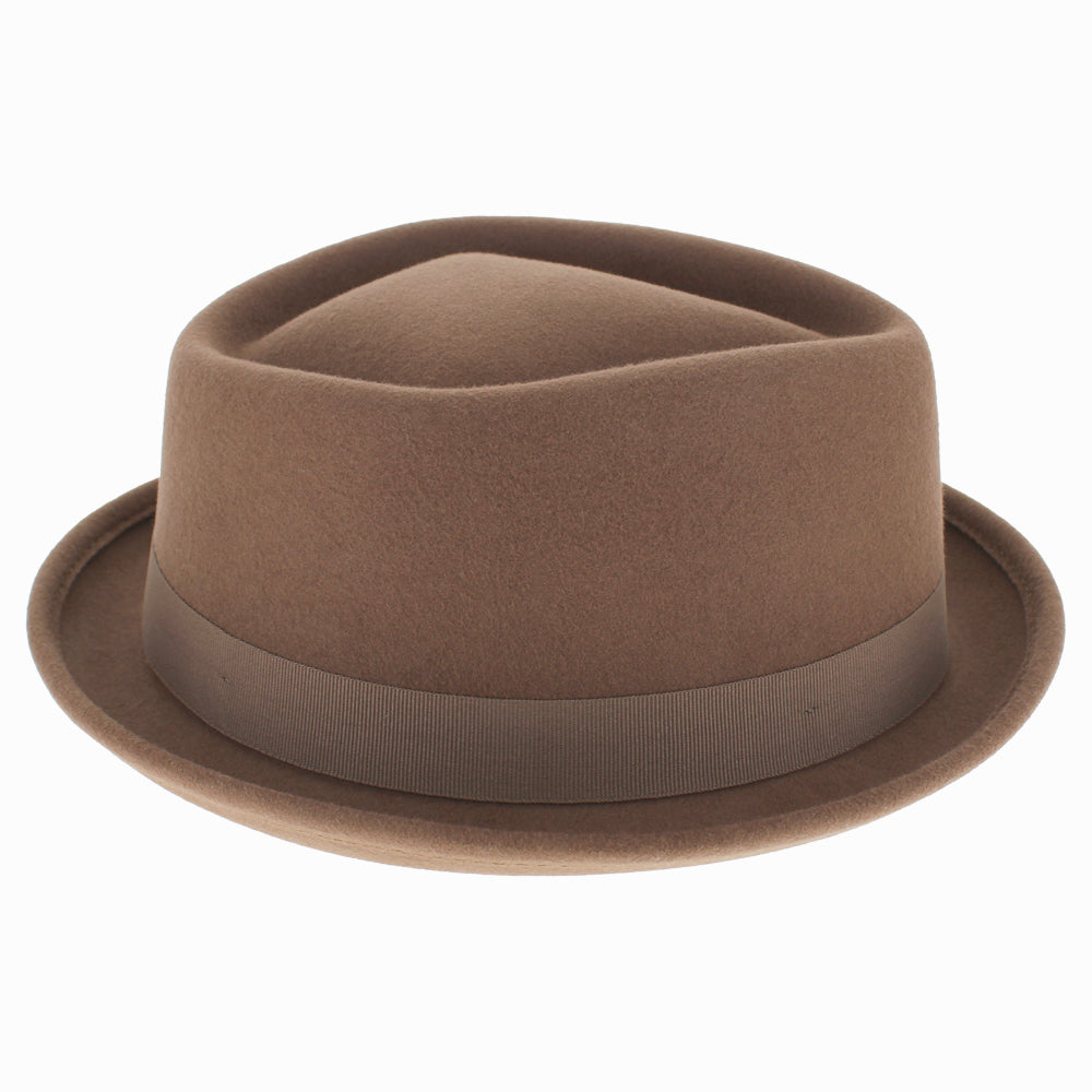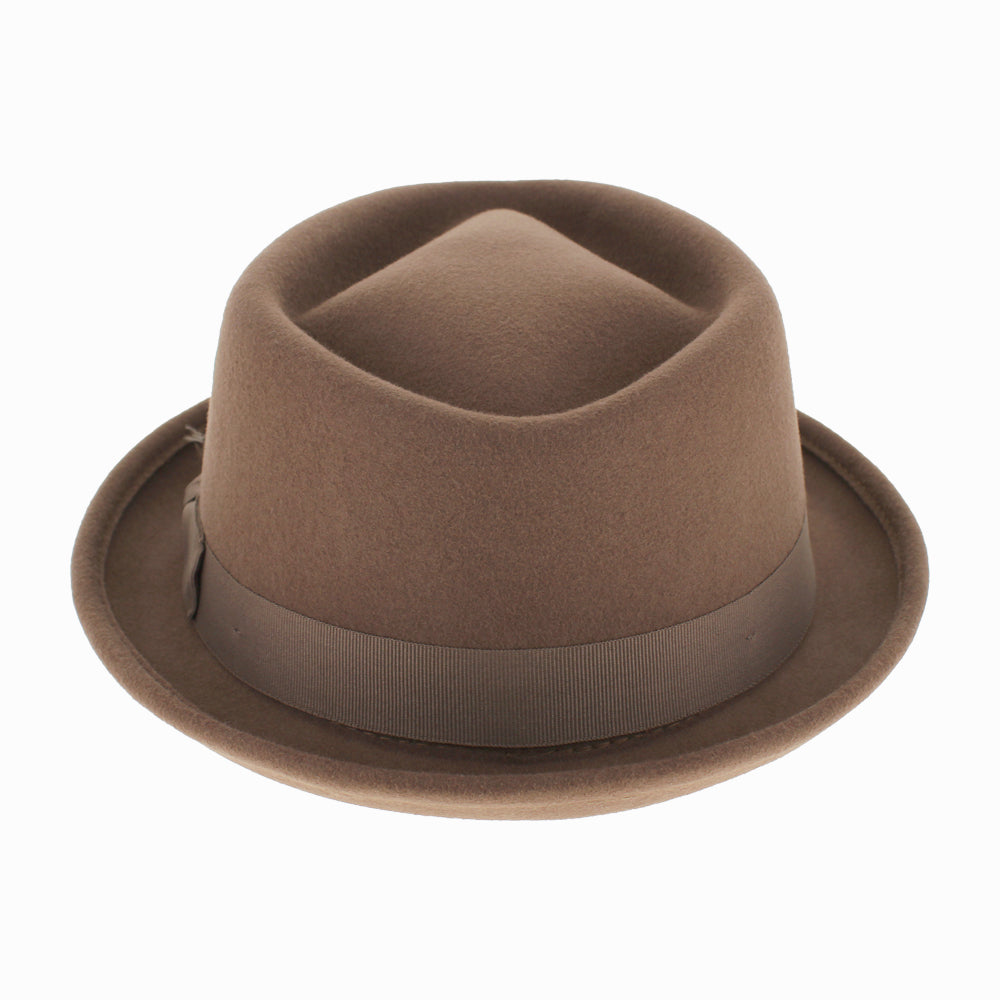 Pecan wool felt pork pie hat with diamond crown and grosgrain band by Belfry