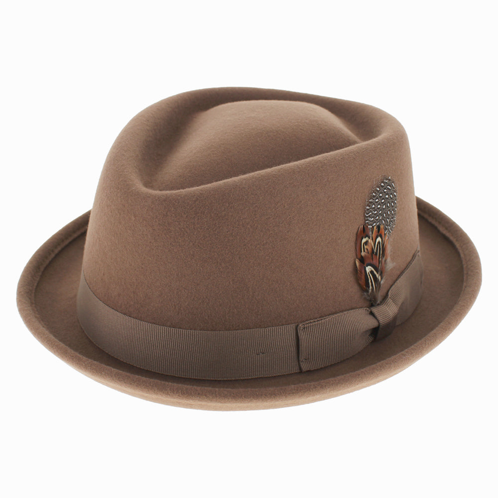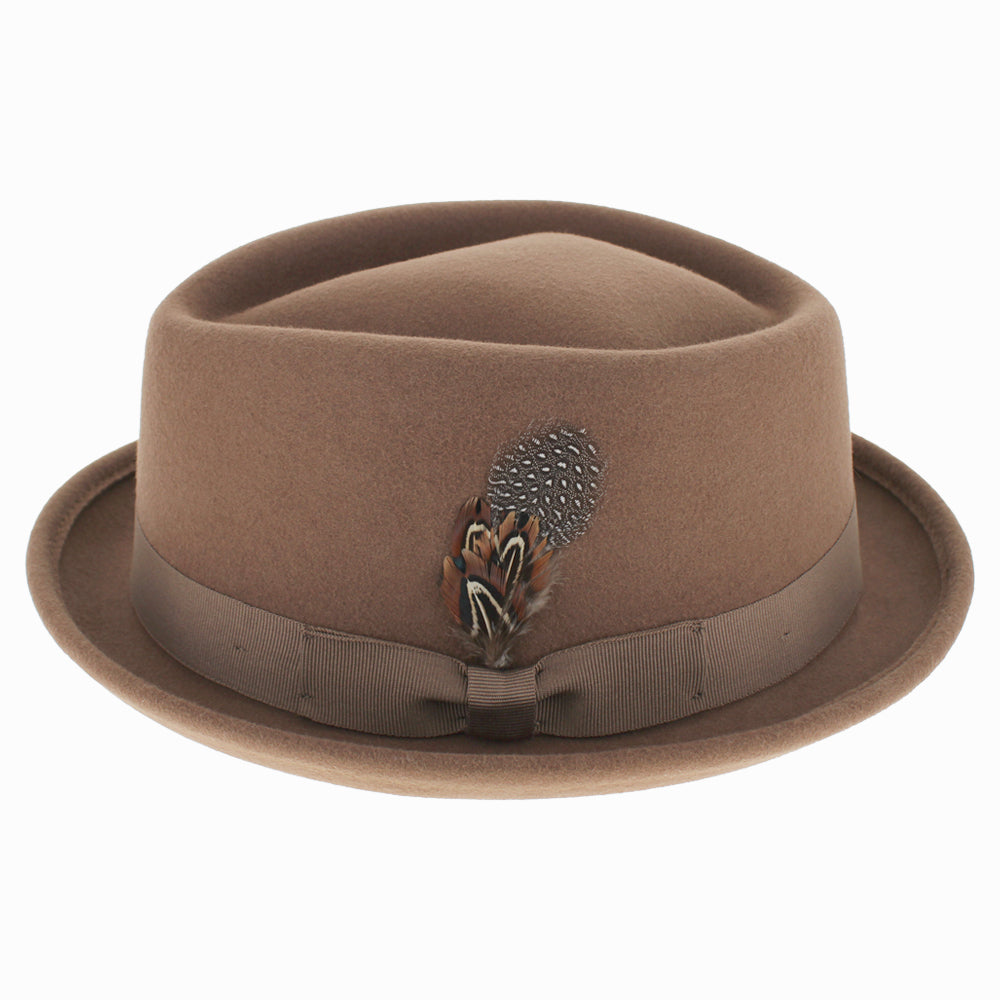 The Belfry Jazz is an affordable men's pork pie hat made of soft 100% wool felt that is both crushable and packable, making it a perfect travel companion. The Jazz's diamond crown is surrounded by a grosgrain ribbon hat band with a removable accent feather.