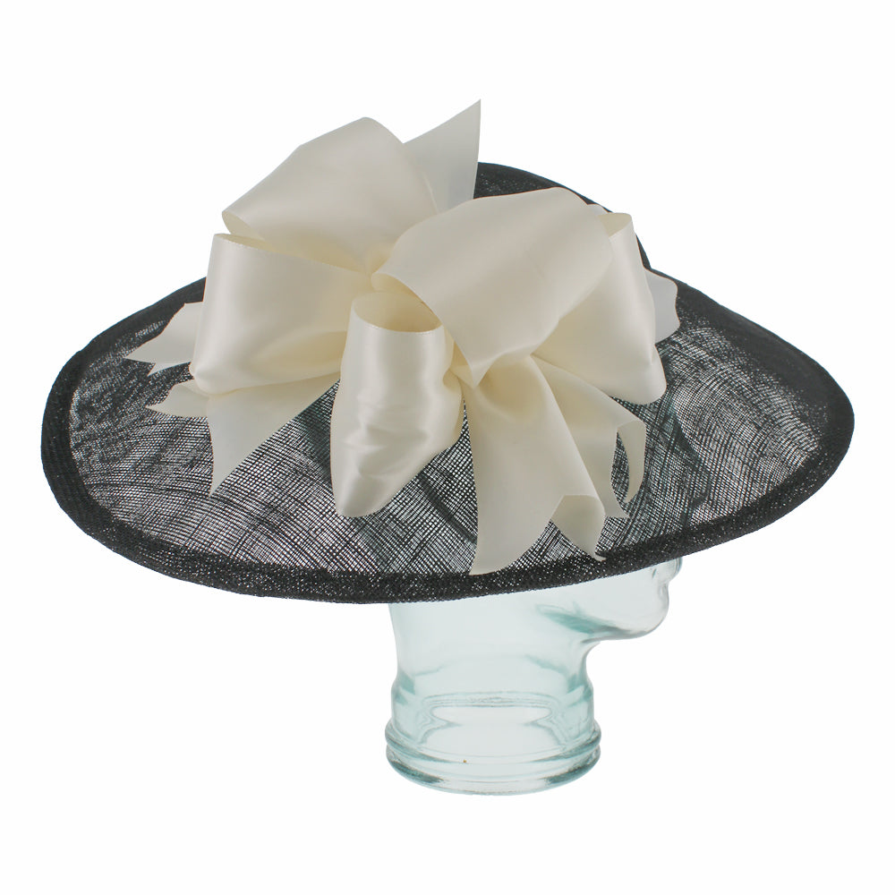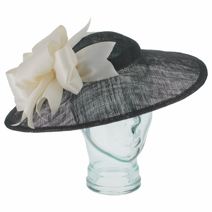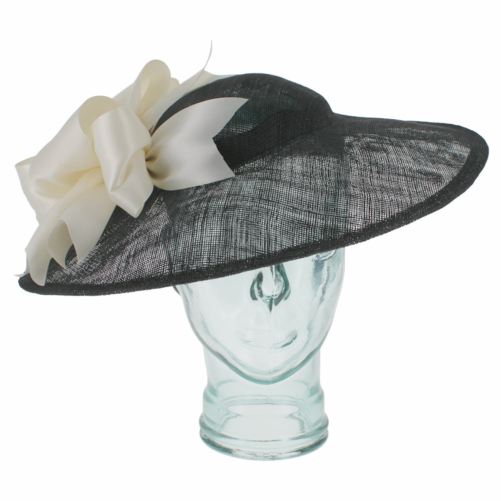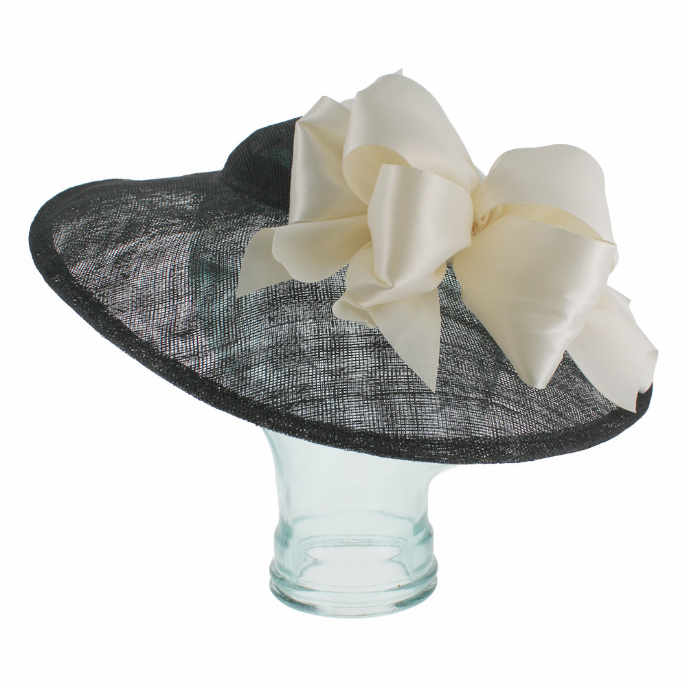 The Belfry Lydia is the perfect combination of classic and chic. This disc fascinator comes in a finely woven sinamay that is rich - nearly black - dark navy in color and contrasted with a romantic tumble of its ivory bow. Utilizing an elastic band that can easily be hidden by styling your hair, it not only ensures the Lydia stays securely in place all day long, but also allows optimal play with just how you wish to wear it.