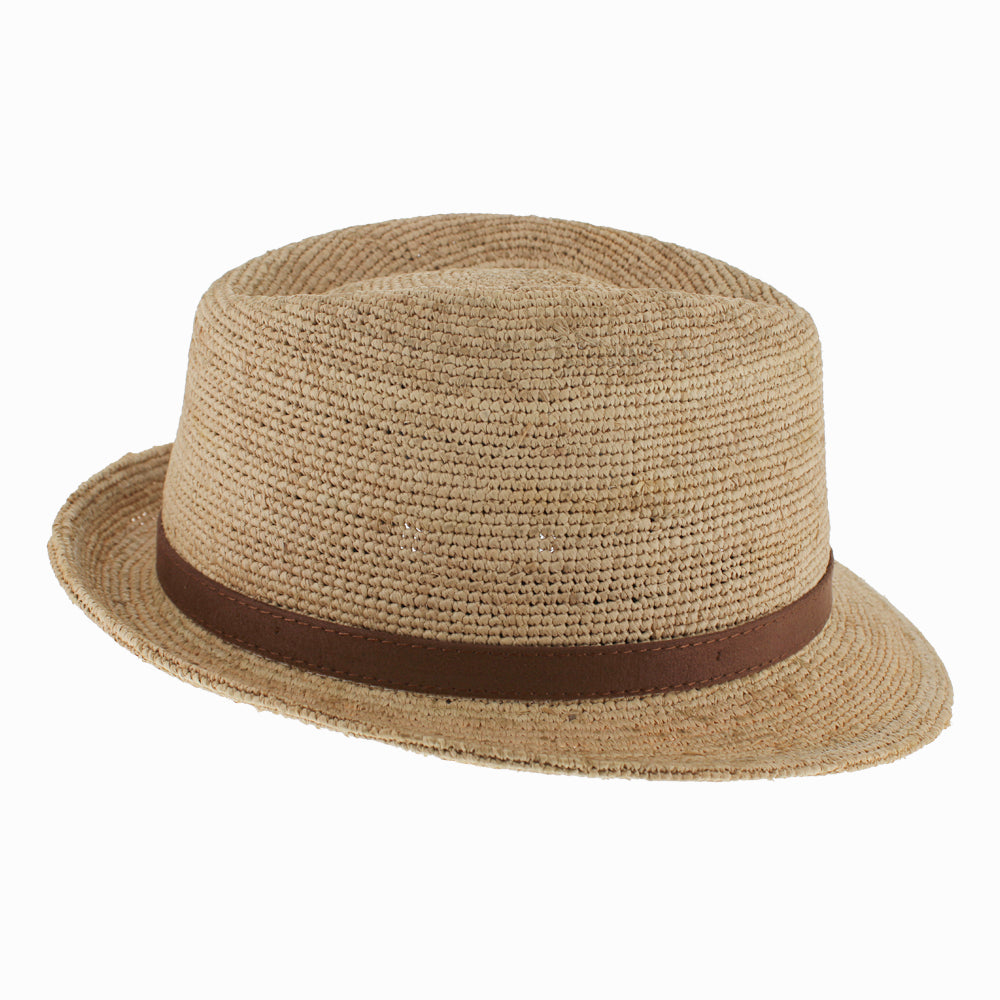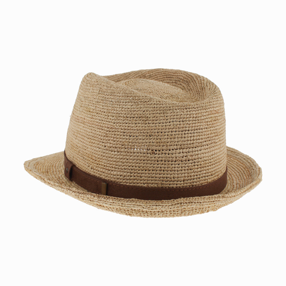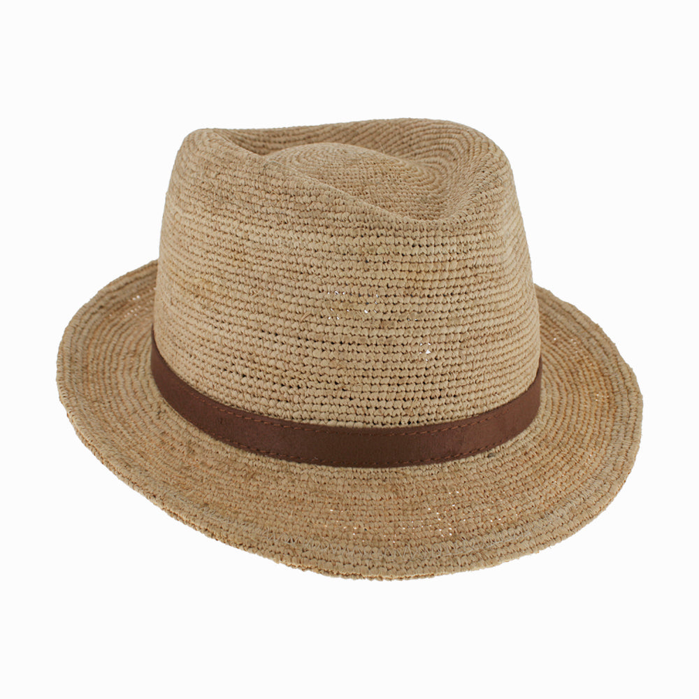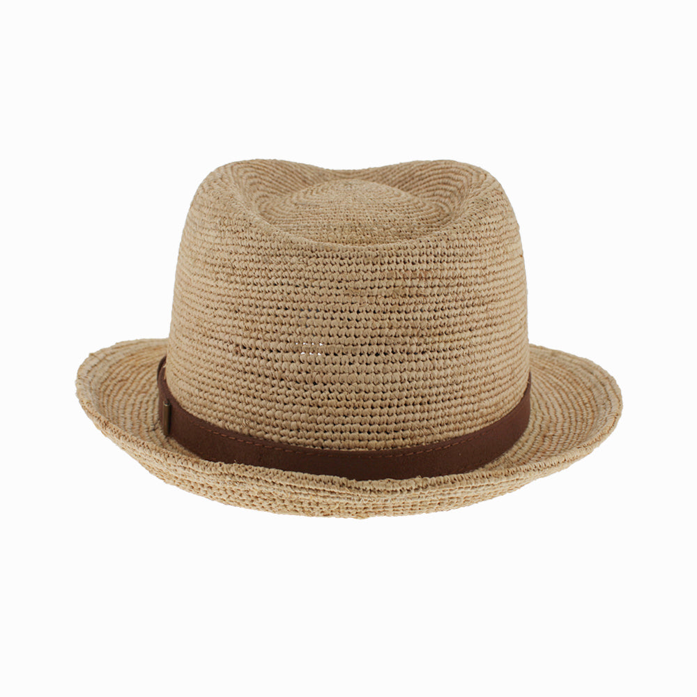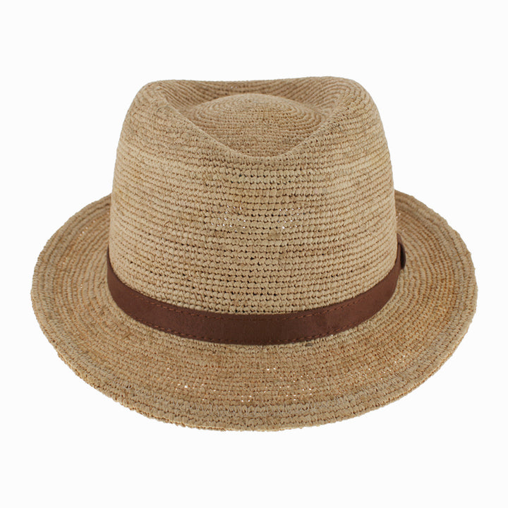 Crocheted raffia trilby hat in natural shade, a go-to summer accessory for men and women